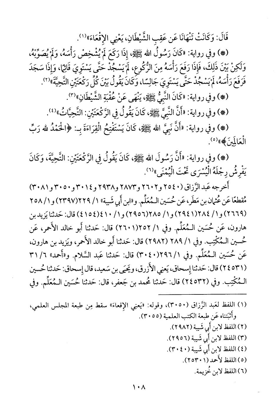 - وفي رواية: «كان رسول الله صَلى الله عَليه وسَلم إذا ركع لم يشخص رأسه، ولم يصوبه، ولكن بين ذلك، فإذا رفع رأسه من الركوع، لم يسجد حتى يستوي قائما، وإذا سجد فرفع رأسه، لم يسجد حتى يستوي جالسا، وكان يقول بين كل ركعتين التحية» (¬١).