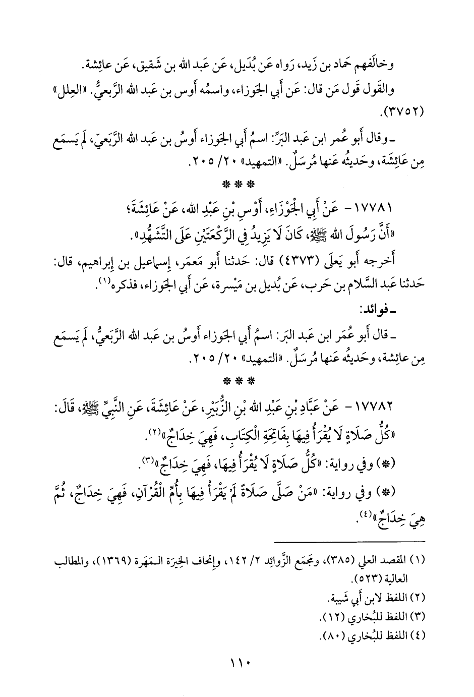 - قال أَبو عمر ابن عبد البَر: اسم أبي الجوزاء أوس بن عبد الله الربعي، لم يسمع من عائشة، وحديثه عنها مرسل. «التمهيد» ٢٠/ ٢٠٥.