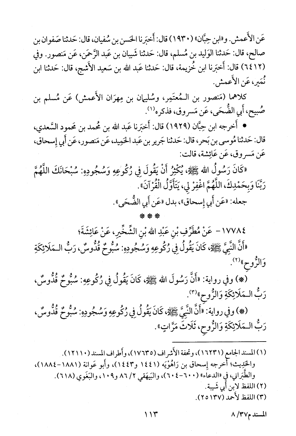 - وفي رواية: «أن النبي صَلى الله عَليه وسَلم كان يقول في ركوعه وسجوده: سبوح قدوس، رب الملائكة والروح، ثلاث مرات».
