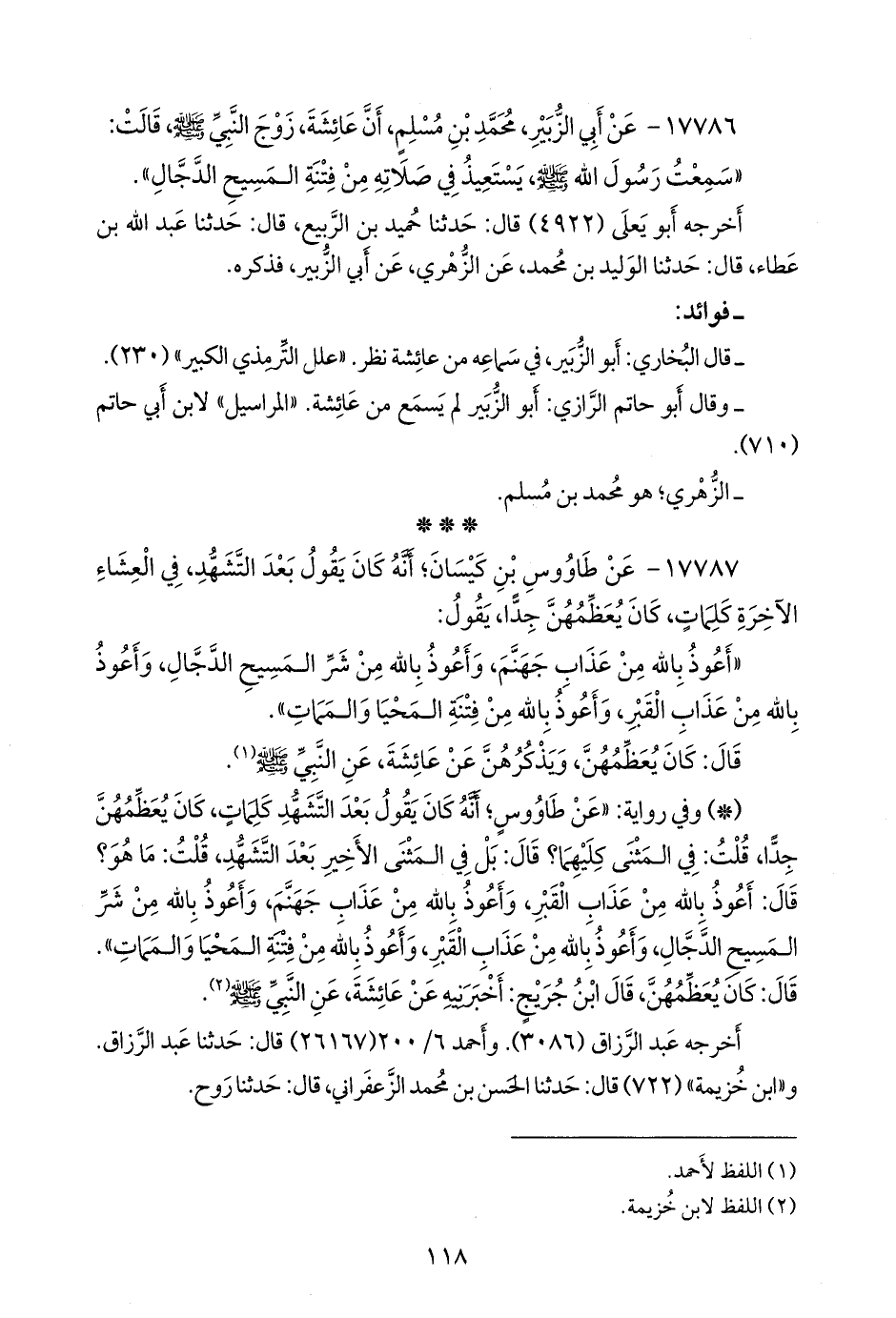 - وفي رواية: «عن طاووس؛ أنه كان يقول بعد التشهد كلمات، كان يعظمهن جدا، قلت: في المثنى كليهما؟ قال: بل في المثنى الأخير بعد التشهد، قلت: ما هو؟ قال: أعوذ بالله من عذاب القبر، وأعوذ بالله من عذاب جهنم، وأعوذ بالله من شر المسيح الدجال، وأعوذ بالله من عذاب القبر، وأعوذ بالله من فتنة المحيا والممات». قال: كان يعظمهن، قال ابن جُريج: أخبرنيه عن عائشة، عن النبي صَلى الله عَليه وسَلم (¬٢).