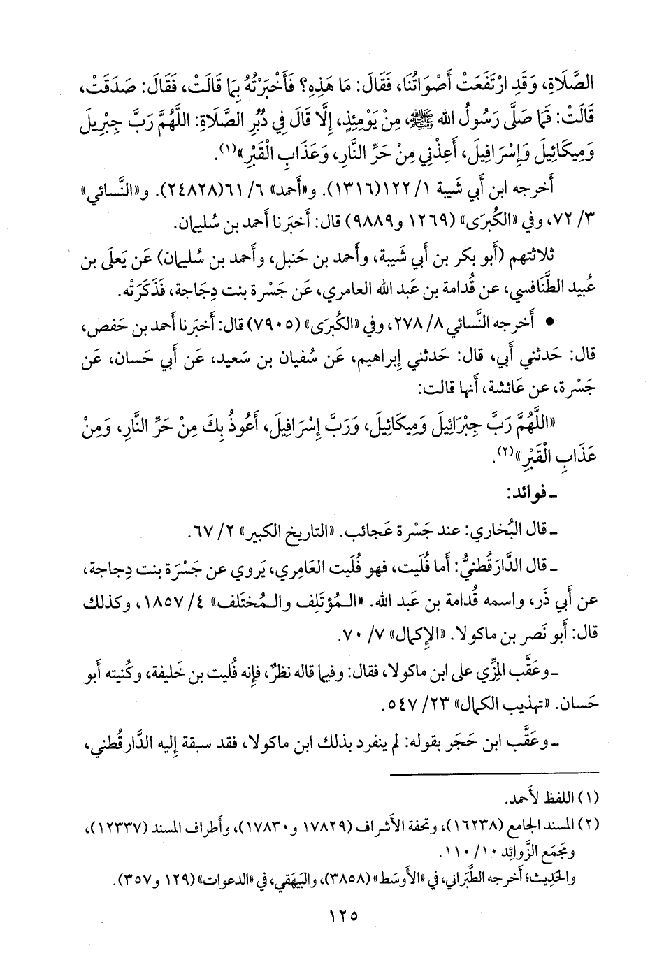 - قلنا: إِسناده ضعيفٌ؛ قال البخاري: عند جَسْرة عجائب. «التاريخ الكبير» ٢/ ٦٧.
