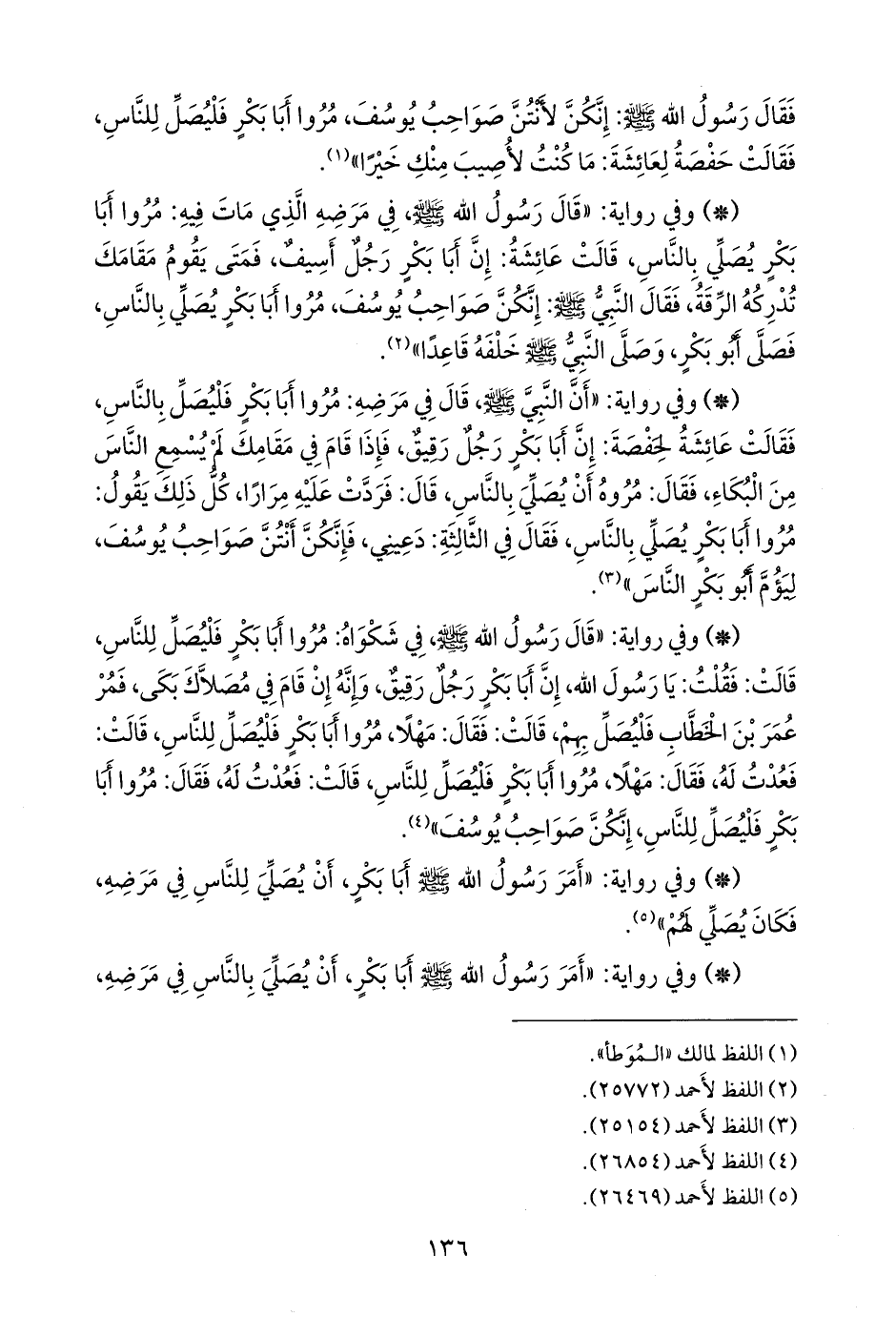 - وفي رواية: «أن النبي صَلى الله عَليه وسَلم قال في مرضه: مروا أبا بكر فليصل بالناس، فقالت عائشة لحفصة: إن أبا بكر رجل رقيق، فإذا قام في مقامك لم يسمع الناس من البكاء، فقال: مروه أن يصلي بالناس، قال: فردت عليه مرارا، كل ذلك يقول: مروا أبا بكر يصلي بالناس، فقال في الثالثة: دعيني، فإنكن أنتن صواحب يوسف، ليؤم أَبو بكر الناس» (¬١).