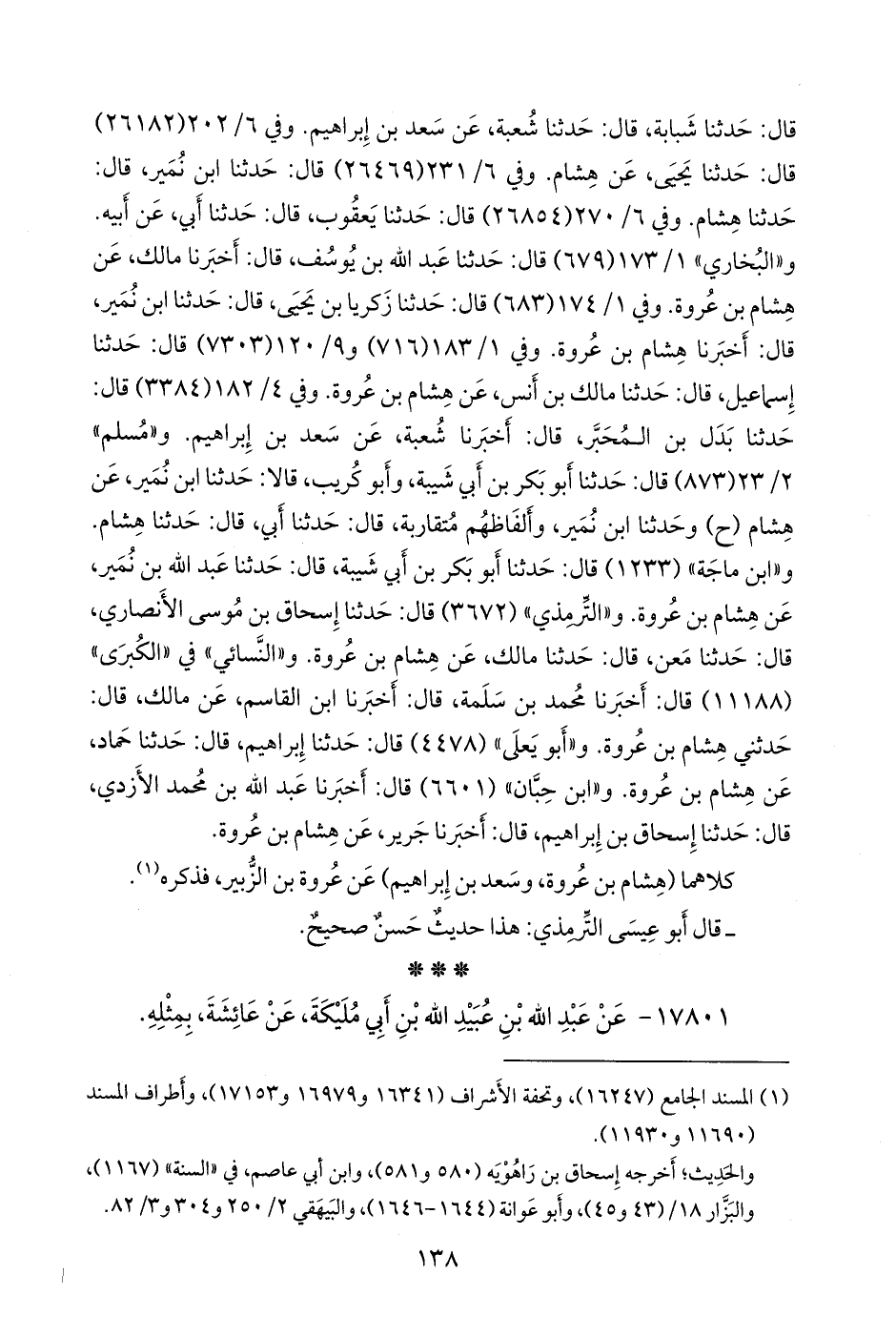 وفي ١/ ١٧٤ (٦٨٣) قال: حدثنا زكريا بن يحيى، قال: حدثنا ابن نُمير، قال: أخبرنا هشام بن عروة. وفي ١/ ١٨٣ (٧١٦) و ٩/ ١٢٠ (٧٣٠٣) قال: حدثنا إسماعيل، قال: حدثنا مالك بن أنس، عن هشام بن عروة. وفي ٤/ ١٨٢ (٣٣٨٤) قال: حدثنا بدل بن المحبر، قال: أخبرنا شعبة، عن سعد بن إبراهيم. و «مسلم» ٢/ ٢٣ (٨٧٣) قال: حدثنا أَبو بكر بن أبي شيبة، وأَبو كُريب، قالا: حدثنا ابن نُمير، عن هشام (ح) وحدثنا ابن نُمير، وألفاظهم متقاربة، قال: حدثنا أبي، قال: حدثنا هشام. و «ابن ماجة» (١٢٣٣) قال: حدثنا أَبو بكر بن أبي شيبة, قال: حدثنا عبد الله بن نُمير، عن هشام بن عروة. و «التِّرمِذي» (٣٦٧٢) قال: حدثنا إسحاق بن موسى الأَنصاري, قال: حدثنا معن, قال: حدثنا مالك، عن هشام بن عروة. و «النَّسَائي» في «الكبرى» (١١١٨٨) قال: أخبرنا محمد بن سلمة، قال: أخبرنا ابن القاسم، عن مالك، قال: حدثني هشام بن عروة. و «أَبو يَعلى» (٤٤٧٨) قال: حدثنا إبراهيم، قال: حدثنا حماد، عن هشام بن عروة. و «ابن حِبَّان» (٦٦٠١) قال: أخبرنا عبد الله بن محمد الأزدي، قال: حدثنا إسحاق بن إبراهيم، قال: أخبرنا جرير، عن هشام بن عروة.