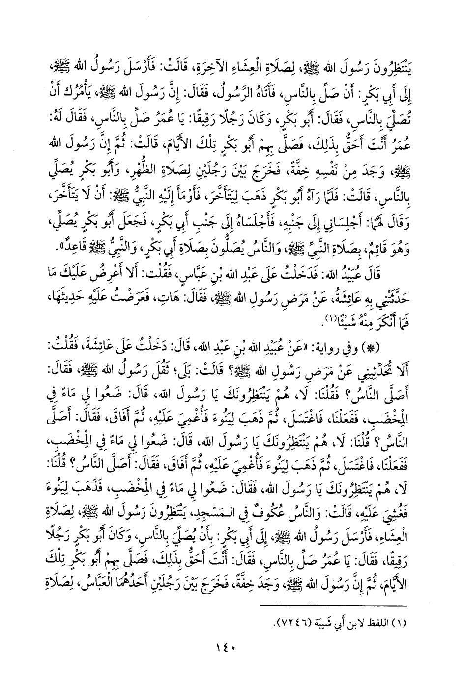 - وفي رواية: «عن عُبيد الله بن عبد الله، قال: دخلت على عائشة، فقلت: ألا تحدثيني عن مرض رسول الله صَلى الله عَليه وسَلم؟ قالت: بلى؛ ثقل رسول الله صَلى الله عَليه وسَلم فقال: أصلى الناس؟ فقلنا: لا، هم ينتظرونك يا رسول الله، قال: ضعوا لي ماء في المخضب، ففعلنا، فاغتسل، ثم ذهب لينوء فأغمي عليه، ثم أفاق، فقال: أصلى الناس؟ قلنا: لا، هم ينتظرونك يا رسول الله، قال: ضعوا لي ماء في المخضب، ففعلنا، فاغتسل، ثم ذهب لينوء فأغمي عليه، ثم أفاق، فقال: أصلى الناس؟ قلنا: لا، هم ينتظرونك يا رسول الله، فقال: ضعوا لي ماء في المخضب، فذهب لينوء فغشي عليه، قالت: والناس عكوف في المسجد، ينتظرون رسول الله صَلى الله عَليه وسَلم لصلاة العشاء، فأرسل رسول الله صَلى الله عَليه وسَلم إلى أَبي بكر: بأن يصلي بالناس، وكان أَبو بكر رجلا رقيقا، فقال: يا عمر صل بالناس، فقال: أنت أحق بذلك، فصلى بهم أَبو بكر تلك الأيام، ثم إن رسول الله صَلى الله عَليه وسَلم وجد خفة، فخرج بين رجلين أحدهما العباس، لصلاة