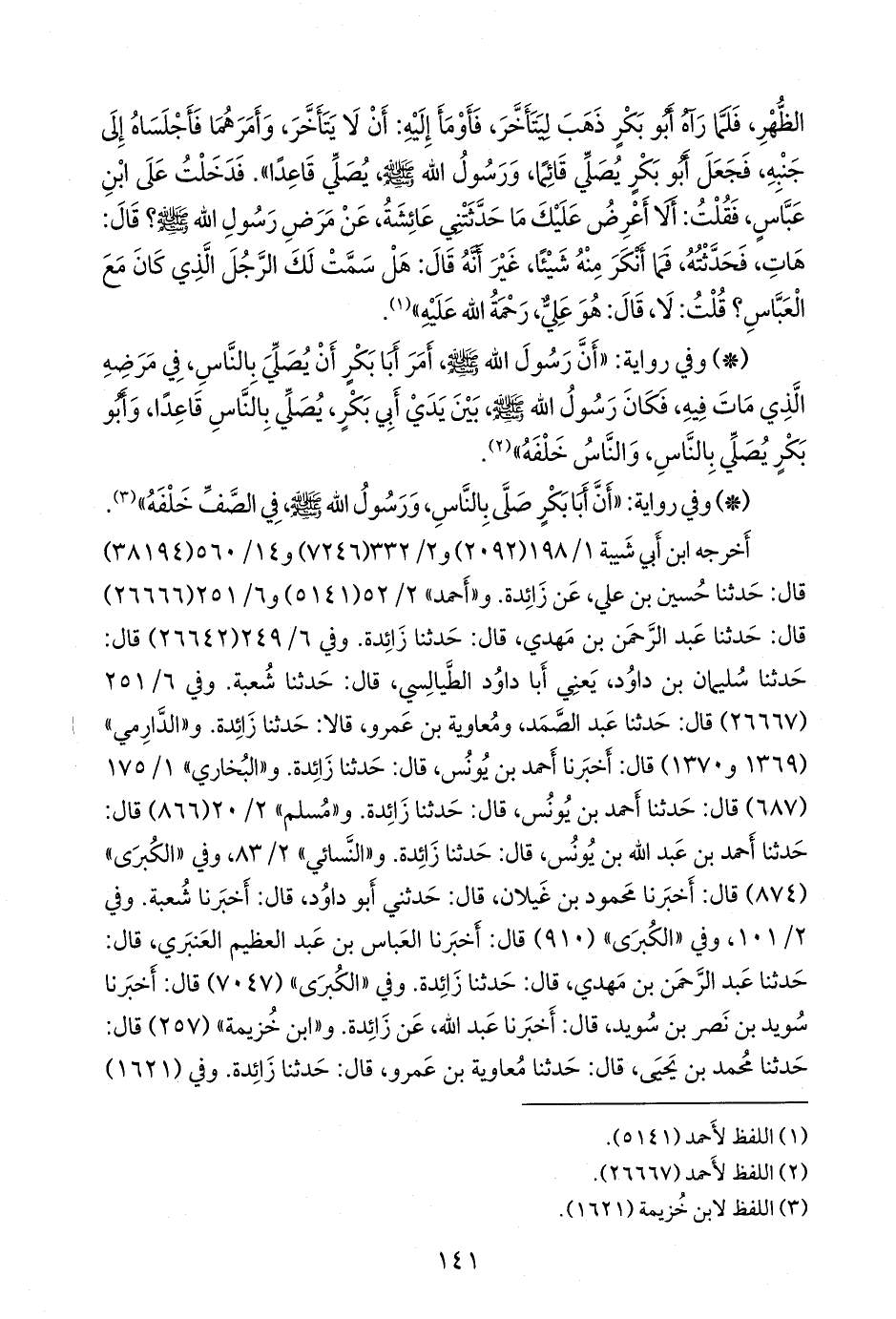فلما رآه أَبو بكر ذهب ليتأخر، فأومأ إليه: أن لا يتأخر، وأمرهما فأجلساه إلى جنبه، فجعل أَبو بكر يصلي قائما، ورسول الله صَلى الله عَليه وسَلم يصلي قاعدا». فدخلت على ابن عباس، فقلت: ألا أعرض عليك ما حدثتني عائشة، عن مرض رسول الله صَلى الله عَليه وسَلم؟ قال: هات، فحدثته، فما أنكر منه شيئا، غير أنه قال: هل سمت لك الرجل الذي كان مع العباس؟ قلت: لا، قال: هو علي، رحمة الله عليه» (¬١).