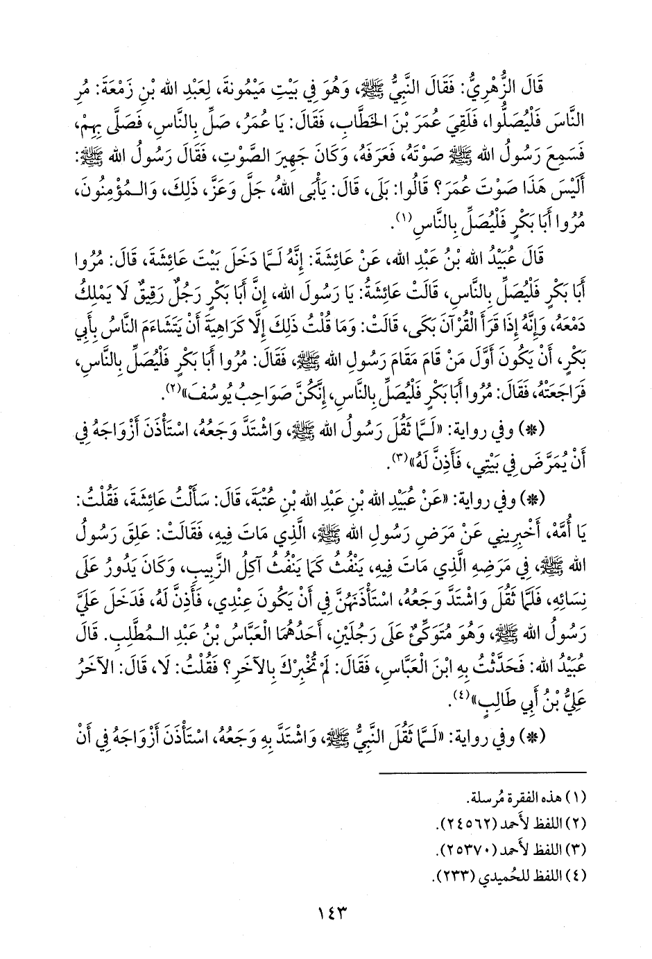- وفي رواية: «عن عُبيد الله بن عبد الله بن عُتبة، قال: سألت عائشة، فقلت: يا أمه، أخبريني عن مرض رسول الله صَلى الله عَليه وسَلم الذي مات فيه، فقالت: علق رسول الله صَلى الله عَليه وسَلم في مرضه الذي مات فيه، ينفث كما ينفث آكل الزبيب، وكان يدور على نسائه، فلما ثقل واشتد وجعه، استاذنهن في أن يكون عندي، فأذن له، فدخل علي رسول الله صَلى الله عَليه وسَلم وهو متوكئ على رجلين، أحدهما العباس بن عبد المطلب. قال عُبيد الله: فحدثت به ابن العباس، فقال: لم تخبرك بالآخر؟ فقلت: لا، قال: الآخر علي بن أبي طالب» (¬٢).