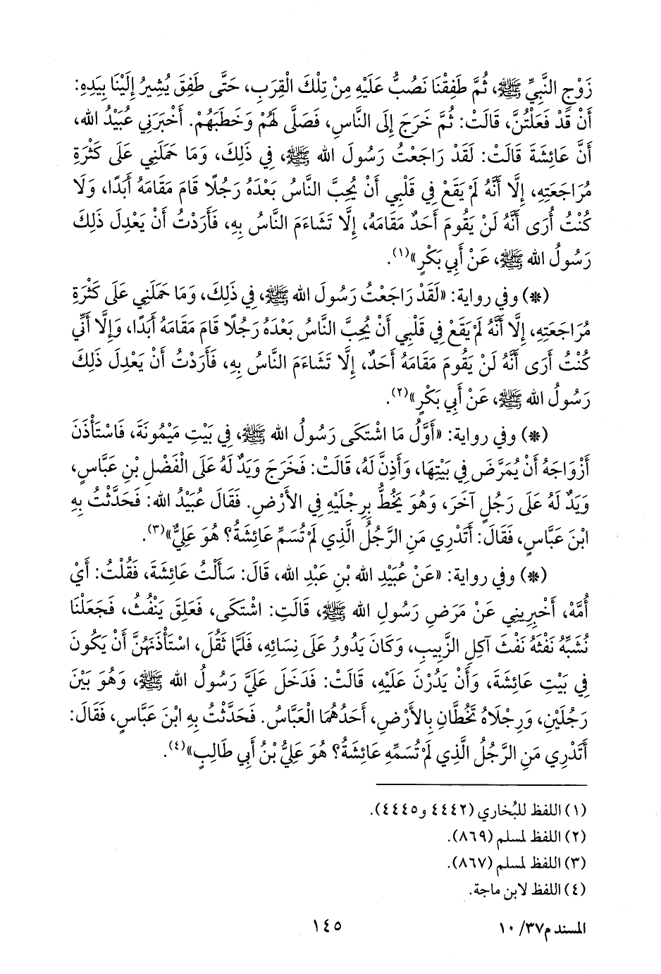 - وفي رواية: «لقد راجعت رسول الله صَلى الله عَليه وسَلم في ذلك، وما حملني على كثرة مراجعته، إلا أنه لم يقع في قلبي أن يحب الناس بعده رجلا قام مقامه أبدا، وإلا أني كنت أرى أنه لن يقوم مقامه أحد، إلا تشاءم الناس به، فأردت أن يعدل ذلك رسول الله صَلى الله عَليه وسَلم عن أَبي بكر» (¬١).