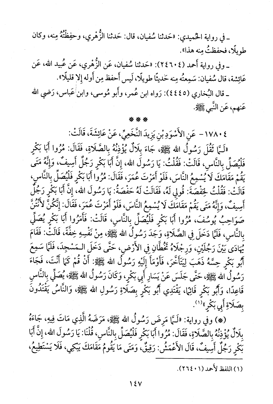 - وفي رواية: «لما مرض رسول الله صَلى الله عَليه وسَلم مرضه الذي مات فيه، جاءه بلال يؤذنه بالصلاة، فقال: مروا أبا بكر فليصل بالناس، قلنا: يا رسول الله، إن أبا بكر رجل أسيف، قال الأعمش: رقيق، ومتى ما يقوم مقامك يبكي، فلا يستطيع،