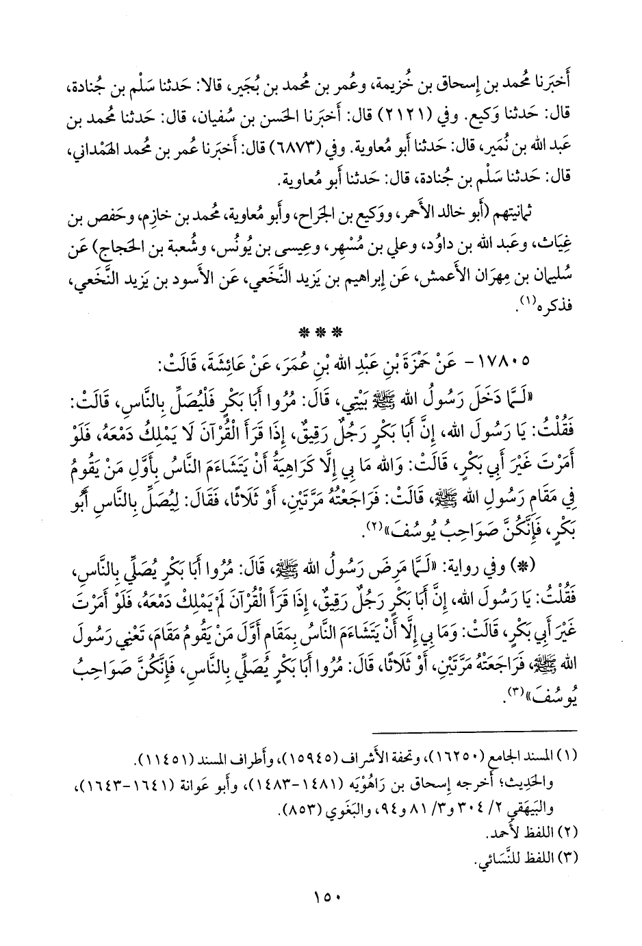 «لما دخل رسول الله صَلى الله عَليه وسَلم بيتي، قال: مروا أبا بكر فليصل بالناس، قالت: فقلت: يا رسول الله، إن أبا بكر رجل رقيق، إذا قرأ القرآن لا يملك دمعه، فلو أمرت غير أَبي بكر، قالت: والله ما بي إلا كراهية أن يتشاءم الناس بأول من يقوم في مقام رسول الله صَلى الله عَليه وسَلم قالت: فراجعته مرتين، أو ثلاثا، فقال: ليصل بالناس أَبو بكر، فإنكن صواحب يوسف» (¬١).