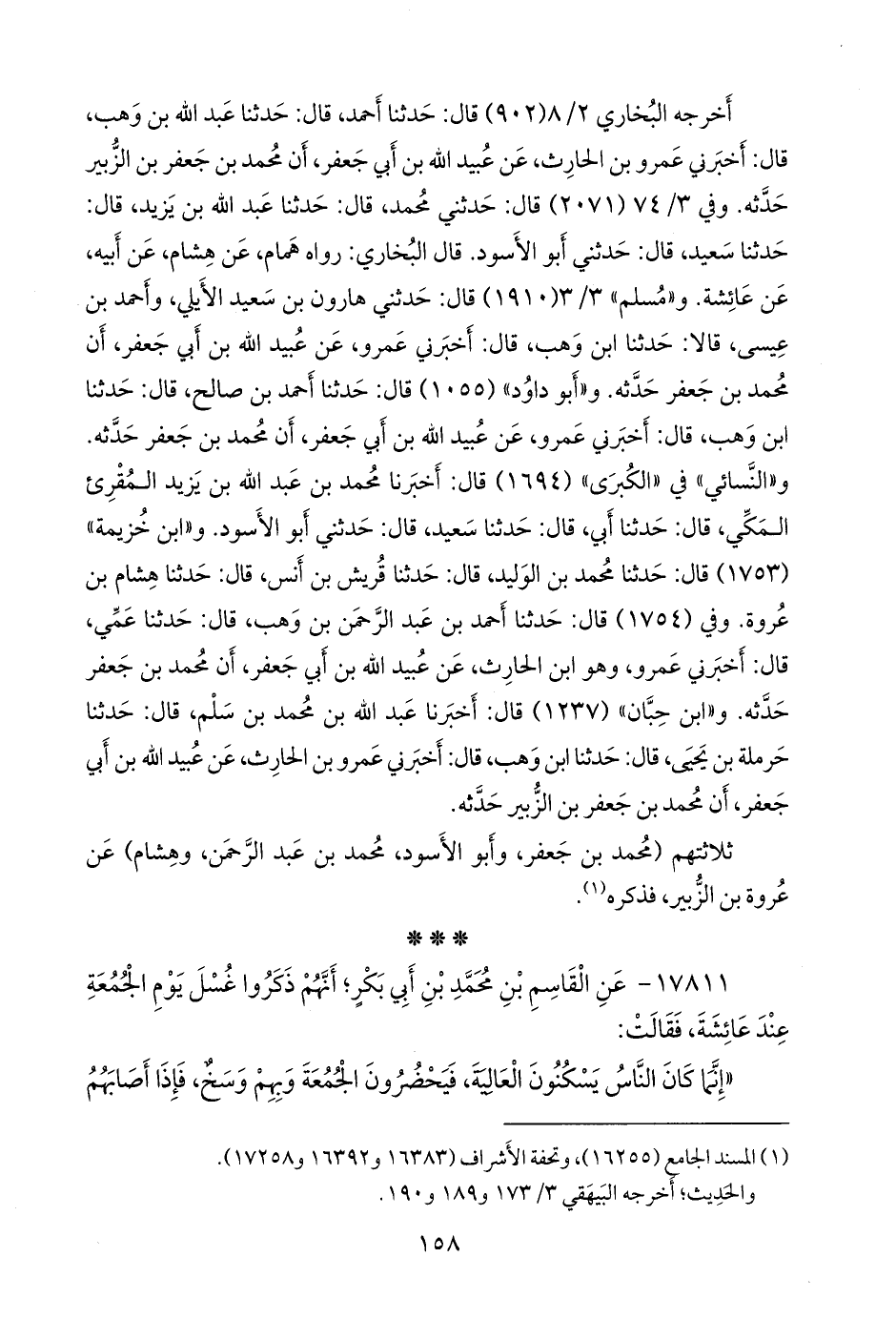 قال البخاري: رواه همام، عن هشام، عن أبيه، عن عائشة. و «مسلم» ٣/ ٣ (١٩١٠) قال: حدثني هارون بن سعيد الأيلي، وأحمد بن عيسى، قالا: حدثنا ابن وهب، قال: أخبرني عَمرو، عن عُبيد الله بن أبي جعفر، أن محمد بن جعفر حدثه. و «أَبو داود» (١٠٥٥) قال: حدثنا أحمد بن صالح, قال: حدثنا ابن وهب، قال: أخبرني عَمرو، عن عُبيد الله بن أبي جعفر، أن محمد بن جعفر حدثه. و «النَّسَائي» في «الكبرى» (١٦٩٤) قال: أخبرنا محمد بن عبد الله بن يزيد المُقرِئ المكي، قال: حدثنا أبي، قال: حدثنا سعيد، قال: حدثني أَبو الأسود. و «ابن خزيمة» (١٧٥٣) قال: حدثنا محمد بن الوليد, قال: حدثنا قريش بن أنس, قال: حدثنا هشام بن عروة. وفي (١٧٥٤) قال: حدثنا أحمد بن عبد الرَّحمَن بن وهب, قال: حدثنا عمي، قال: أخبرني عَمرو، وهو ابن الحارث، عن عُبيد الله بن أبي جعفر، أن محمد بن جعفر حدثه. و «ابن حِبَّان» (١٢٣٧) قال: أخبرنا عبد الله بن محمد بن سَلم، قال: حدثنا حَرملة بن يحيى، قال: حدثنا ابن وهب، قال: أخبرني عَمرو بن الحارث، عن عُبيد الله بن أبي جعفر، أن محمد بن جعفر بن الزبير حدثه.