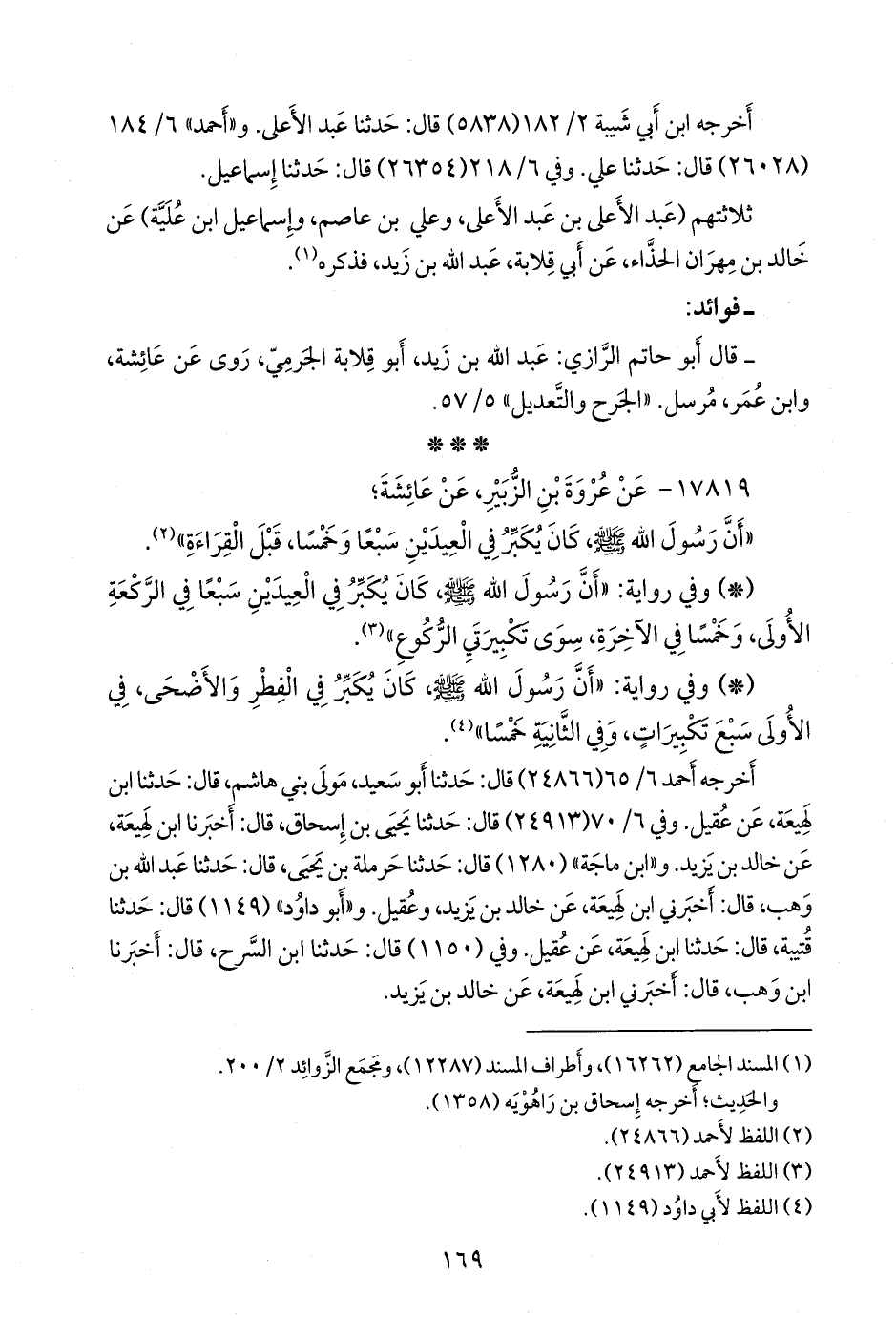 - وفي رواية: «أن رسول الله صَلى الله عَليه وسَلم كان يكبر في الفطر والأضحى، في الأولى سبع تكبيرات، وفي الثانية خمسا» (¬٣).