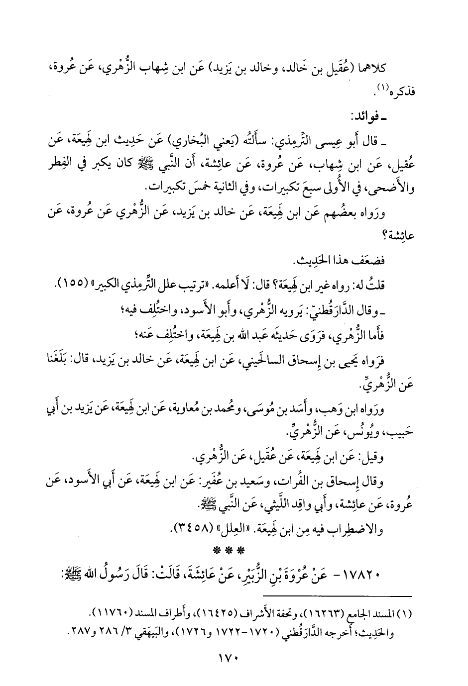 - قال التِّرمِذي: سألته، يعني البخاري، عن حديث ابن لَهِيعة، عن عُقيل، عن ابن شهاب، عن عروة، عن عائشة، أن النبي صَلى الله عَليه وسَلم كان يكبر في الفطر والأضحى، في الأولى سبع تكبيرات، وفي الثانية خمس تكبيرات.