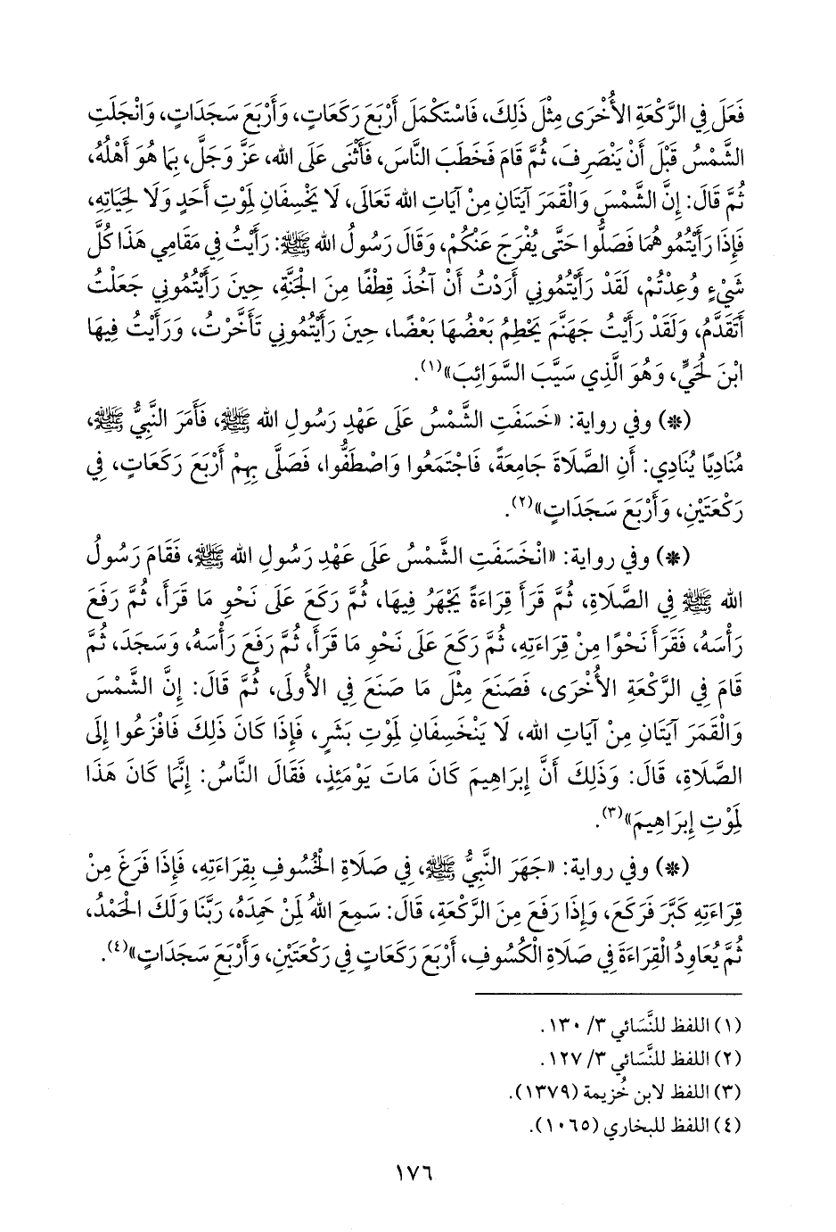 - وفي رواية: «انخسفت الشمس على عهد رسول الله صَلى الله عَليه وسَلم فقام رسول الله صَلى الله عَليه وسَلم في الصلاة، ثم قرأ قراءة يجهر فيها، ثم ركع على نحو ما قرأ، ثم رفع رأسه، فقرأ نحوا من قراءته، ثم ركع على نحو ما قرأ، ثم رفع رأسه، وسجد، ثم قام في الركعة الأخرى، فصنع مثل ما صنع في الأولى، ثم قال: إن الشمس والقمر آيتان من آيات الله، لا ينخسفان لموت بشر، فإذا كان ذلك فافزعوا إلى الصلاة، قال: وذلك أن إبراهيم كان مات يومئذ، فقال الناس: إنما كان هذا لموت إبراهيم» (¬٣).