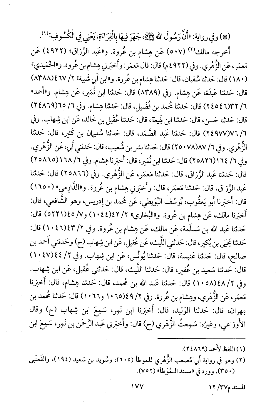 أخرجه مالك (¬٢) (٥٠٧) عن هشام بن عروة. و «عبد الرزاق» (٤٩٢٢) عن مَعمَر، عن الزُّهْري. وفي (٤٩٢٢ م) قال: قال معمر: وأخبرني هشام بن عروة. و «الحميدي» (١٨٠) قال: حدثنا سفيان، قال: حدثنا هشام بن عروة. و «ابن أبي شيبة» (٨٣٨٨) قال: حدثنا عبدة، عن هشام. وفي (٨٣٨٩) قال: حدثنا ابن نُمير، عن هشام. و «أحمد» ٦/ ٣٢ (٢٤٥٤٦) قال: حدثنا محمد بن فضيل، قال: حدثنا هشام. وفي ٦/ ٦٥ (٢٤٨٦٩) قال: حدثنا حسن, قال: حدثنا ابن لَهِيعة, قال: حدثنا عُقيل بن خالد، عن ابن شهاب. وفي ٦/ ٧٦ (٢٤٩٧٧) قال: حدثنا عبد الصمد, قال: حدثنا سليمان بن كثير، قال: حدثنا الزُّهْري. وفي ٦/ ٨٧ (٢٥٠٧٨) قال: حدثنا بشر بن شعيب، قال: حدثني أبي، عن الزُّهْري. وفي ٦/ ١٦٤ (٢٥٨٢٦) قال: حدثنا ابن نُمير، قال: أخبرنا هشام. وفي ٦/ ١٦٨ (٢٥٨٦٥) قال: حدثنا عبد الرزاق، قال: حدثنا مَعمَر، عن الزُّهْري. وفي (٢٥٨٦٦) قال: حدثنا عبد الرزاق، قال: حدثنا مَعمَر، قال: وأخبرني هشام بن عروة. و «الدَّارِمي» (١٦٥٠) قال: أخبرنا أَبو يعقوب، يوسف البويطي، عن محمد بن إدريس، وهو الشافعي، قال: أخبرنا مالك، عن هشام بن عروة. و «البخاري» ٢/ ٤٢ (١٠٤٤) و ٧/ ٤٥ (٥٢٢١) قال: حدثنا عبد الله بن مَسلَمة، عن مالك، عن هشام بن عروة. وفي ٢/ ٤٣ (١٠٤٦) قال: حدثنا يحيى بن بُكير، قال: حدثني الليث، عن عُقيل، عن ابن شهاب (ح) وحدثني أحمد بن صالح، قال: حدثنا عنبسة، قال: حدثنا يونس، عن ابن شهاب. وفي ٢/ ٤٤ (١٠٤٧) قال: حدثنا سعيد بن عفير، قال: حدثنا الليث، قال: حدثني عُقيل، عن ابن شهاب. وفي ٢/ ٤٨ (١٠٥٨) قال: حدثنا عبد الله بن محمد، قال: حدثنا هشام، قال: أخبرنا مَعمَر، عن الزُّهْري، وهشام بن عروة. وفي ٢/ ٤٩ (١٠٦٥ و ١٠٦٦) قال: حدثنا محمد بن مِهران، قال: حدثنا الوليد، قال: أخبرنا ابن نمر، سمع ابن شهاب (ح) وقال الأوزاعي، وغيره: سمعت الزُّهْري (ح) قال: وأخبرني عبد الرَّحمَن بن نمر، سمع ابن