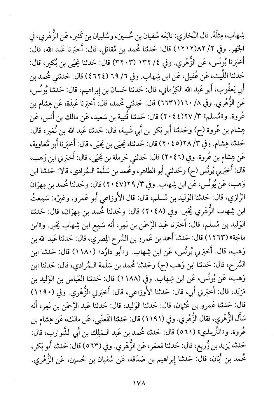 قال البخاري: تابعه سفيان بن حسين، وسليمان بن كثير، عن الزُّهْري، في الجهر. وفي ٢/ ٨٢ (١٢١٢) قال: حدثنا محمد بن مقاتل، قال: أخبرنا عبد الله، قال: أخبرنا يونس، عن الزُّهْري. وفي ٤/ ١٣٢ (٣٢٠٣) قال: حدثنا يحيى بن بُكير, قال: حدثنا الليث، عن عُقيل، عن ابن شهاب. وفي ٦/ ٦٩ (٤٦٢٤) قال: حدثني محمد بن أبي يعقوب، أَبو عبد الله الكرماني, قال: حدثنا حسان بن إبراهيم, قال: حدثنا يونس، عن الزُّهْري. وفي ٨/ ١٦٠ (٦٦٣١) قال: حدثني محمد، قال: أخبرنا عبدة، عن هشام بن عروة. و «مسلم» ٣/ ٢٧ (٢٠٤٤) قال: حدثنا قتيبة بن سعيد، عن مالك بن أنس، عن هشام بن عروة (ح) وحدثنا أَبو بكر بن أبي شيبة، قال: حدثنا عبد الله بن نُمير، قال: حدثنا هشام. وفي ٣/ ٢٨ (٢٠٤٥) قال: حدثناه يحيى بن يحيى، قال: أخبرنا أَبو معاوية، عن هشام بن عروة. وفي (٢٠٤٦) قال: حدثني حَرملة بن يحيى، قال: أخبرني ابن وهب، قال: أخبرني يونس (ح) وحدثني أَبو الطاهر، ومحمد بن سلمة المرادي، قالا: حدثنا ابن وهب، عن يونس، عن ابن شهاب. وفي ٣/ ٢٩ (٢٠٤٧) قال: وحدثنا محمد بن مِهران الرازي, قال: حدثنا الوليد بن مسلم، قال: قال الأوزاعي أَبو عَمرو، وغيره: سمعت ابن شهاب الزُّهْري يخبر. وفي (٢٠٤٨) قال: وحدثنا محمد بن مِهران, قال: حدثنا الوليد بن مسلم، قال: أخبرنا عبد الرَّحمَن بن نمر، أنه سمع ابن شهاب يخبر. و «ابن ماجة» (١٢٦٣) قال: حدثنا أحمد بن عَمرو بن السَّرح المصري, قال: حدثنا عبد الله بن وهب، قال: أخبرني يونس، عن ابن شهاب. و «أَبو داود» (١١٨٠) قال: حدثنا ابن السَّرح، قال: حدثنا ابن وهب (ح) وحدثنا محمد بن سلمة المرادي, قال: حدثنا ابن وهب، عن يونس، عن ابن شهاب. وفي (١١٨٨) قال: حدثنا العباس بن الوليد بن مزيد، قال: أخبرني أبي, قال: حدثنا الأوزاعي، قال: أخبرني الزُّهْري. وفي (١١٩٠) قال: حدثنا عَمرو بن عثمان, قال: حدثنا الوليد, قال: حدثنا عبد الرَّحمَن بن نمر، أنه سأل الزُّهْري، فقال الزُّهْري. وفي (١١٩١) قال: حدثنا القَعنَبي، عن مالك، عن هشام بن عروة. و «التِّرمِذي» (٥٦١) قال: حدثنا محمد بن عبد الملك بن أبي الشوارب, قال: حدثنا يزيد بن زُريع, قال: حدثنا مَعمَر، عن الزُّهْري. وفي (٥٦٣) قال: حدثنا أَبو بكر، محمد بن أبان, قال: حدثنا إبراهيم بن صدقة، عن سفيان بن حسين، عن الزُّهْري.