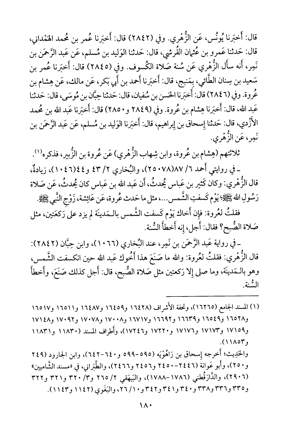 وفي (٢٨٤٢) قال: أخبرنا عمر بن محمد الهمداني، قال: حدثنا عَمرو بن عثمان القرشي، قال: حدثنا الوليد بن مسلم، عن عبد الرَّحمَن بن نمر، أنه سأل الزُّهْري عن سنة صلاة الكسوف. وفي (٢٨٤٥) قال: أخبرنا عمر بن سعيد بن سنان الطائي، بِمَنْبِج، قال: أخبرنا أحمد بن أَبي بكر، عن مالك، عن هشام بن عروة. وفي (٢٨٤٦) قال: أخبرنا الحسن بن سفيان، قال: حدثنا حِبَّان بن موسى، قال: حدثنا عبد الله، قال: أخبرنا هشام بن عروة. وفي (٢٨٤٩ و ٢٨٥٠) قال: أخبرنا عبد الله بن محمد الأزدي، قال: حدثنا إسحاق بن إبراهيم، قال: أخبرنا الوليد بن مسلم، عن عبد الرَّحمَن بن نمر، عن الزُّهْري.