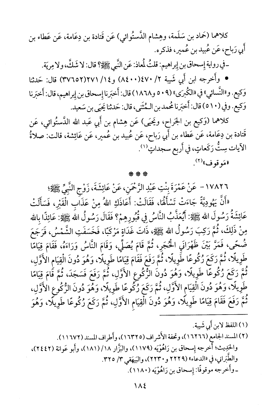كلاهما (وكيع بن الجراح، ويحيى) عن هشام بن أبي عبد الله الدَّستوائي، عن قتادة بن دعامة، عن عطاء بن أبي رباح، عن عُبيد بن عُمير، عن عائشة، قالت: صلاة الآيات ست ركعات، في أربع سجدات (¬١).