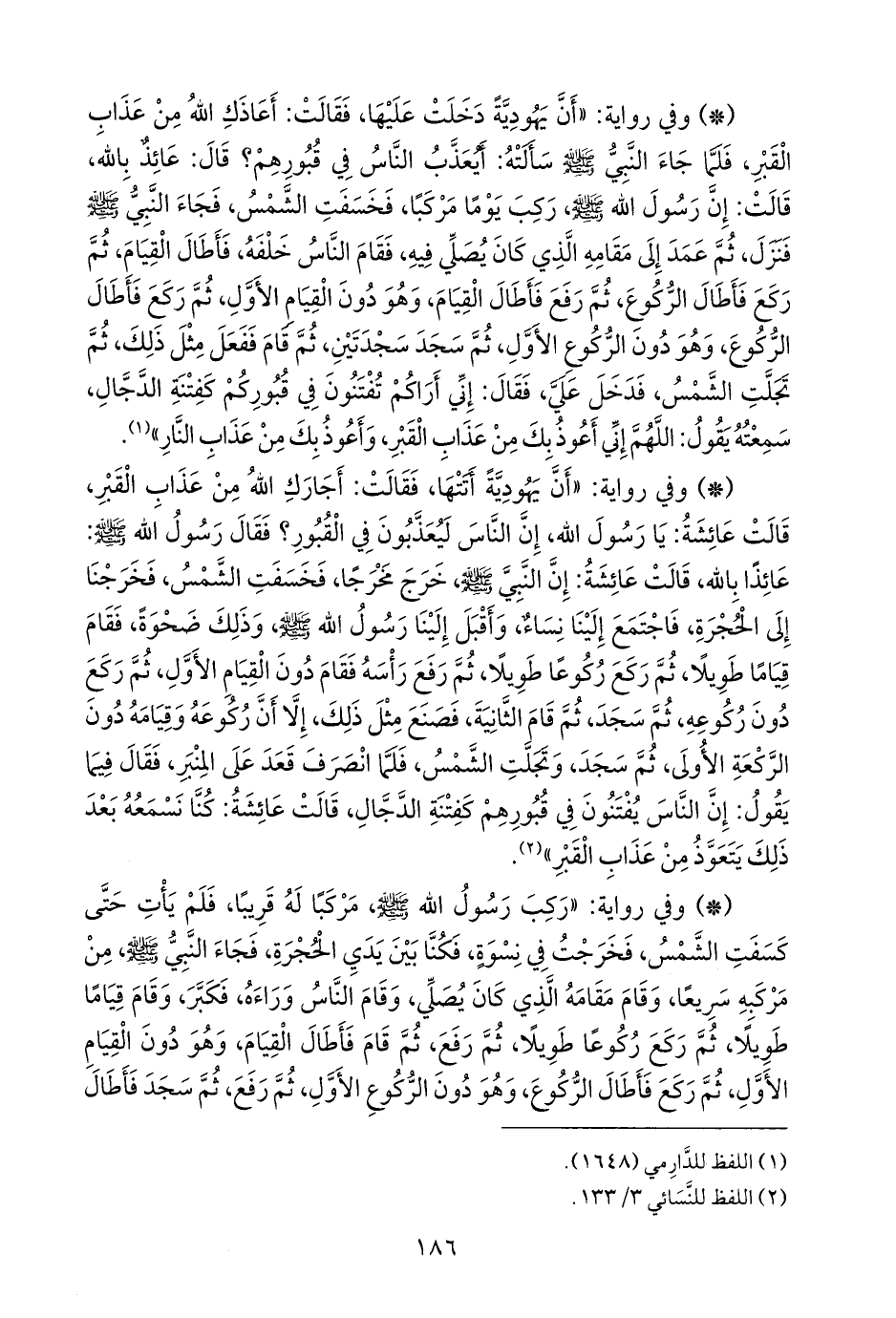 - وفي رواية: «أن يهودية دخلت عليها، فقالت: أعاذك الله من عذاب القبر، فلما جاء النبي صَلى الله عَليه وسَلم سألته: أيعذب الناس في قبورهم؟ قال: عائذ بالله، قالت: إن رسول الله صَلى الله عَليه وسَلم ركب يوما مركبا، فخسفت الشمس، فجاء النبي صَلى الله عَليه وسَلم فنزل، ثم عمد إلى مقامه الذي كان يصلي فيه، فقام الناس خلفه، فأطال القيام، ثم ركع فأطال الركوع، ثم رفع فأطال القيام، وهو دون القيام الأول، ثم ركع فأطال الركوع، وهو دون الركوع الأول، ثم سجد سجدتين، ثم قام ففعل مثل ذلك، ثم تجلت الشمس، فدخل علي، فقال: إني أراكم تفتنون في قبوركم كفتنة الدجال، سمعته يقول: اللهم إني أعوذ بك من عذاب القبر، وأعوذ بك من عذاب النار» (¬١).