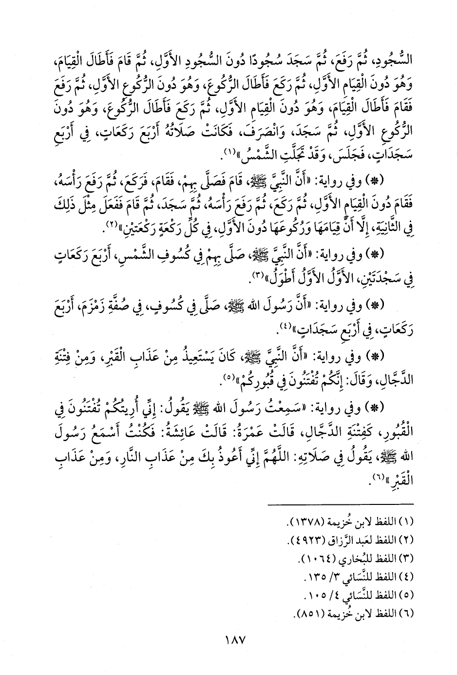 - وفي رواية: «أن رسول الله صَلى الله عَليه وسَلم صلى في كسوف، في صفة زمزم، أربع ركعات، في أربع سجدات» (¬١).