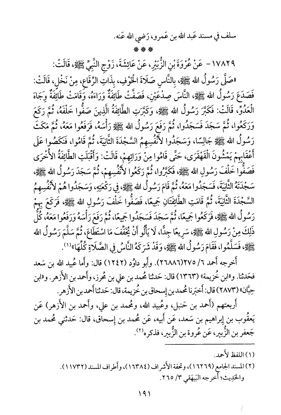«صلى رسول الله صَلى الله عَليه وسَلم بالناس صلاة الخوف، بذات الرقاع، من نخل، قالت: فصدع رسول الله صَلى الله عَليه وسَلم الناس صدعين، فصفت طائفة وراءه، وقامت طائفة وجاه العدو، قالت: فكبر رسول الله صَلى الله عَليه وسَلم وكبرت الطائفة الذين صفوا خلفه، ثم ركع وركعوا، ثم سجد فسجدوا، ثم رفع رسول الله صَلى الله عَليه وسَلم رأسه، فرفعوا معه، ثم مكث رسول الله صَلى الله عَليه وسَلم جالسا، وسجدوا لأنفسهم السجدة الثانية، ثم قاموا، فنكصوا على أعقابهم يمشون القهقرى، حتى قاموا من وراءهم، قالت: وأقبلت الطائفة الأخرى فصفوا خلف رسول الله صَلى الله عَليه وسَلم فكبروا، ثم ركعوا لأنفسهم، ثم سجد رسول الله صَلى الله عَليه وسَلم سجدته الثانية، فسجدوا معه، ثم قام رسول الله صَلى الله عَليه وسَلم في ركعته، وسجدوا هم لأنفسهم السجدة الثانية، ثم قامت الطائفتان جميعا، فصفوا خلف رسول الله صَلى الله عَليه وسَلم فركع بهم رسول الله صَلى الله عَليه وسَلم فركعوا جميعا، ثم سجد فسجدوا جميعا، ثم رفع رأسه ورفعوا معه، كل ذلك من رسول الله صَلى الله عَليه وسَلم سريعا جدا، لا يالو أن يخفف ما استطاع، ثم سلم رسول الله صَلى الله عَليه وسَلم فسلموا، فقام رسول الله صَلى الله عَليه وسَلم وقد شركه الناس في الصلاة كلها» (¬١).