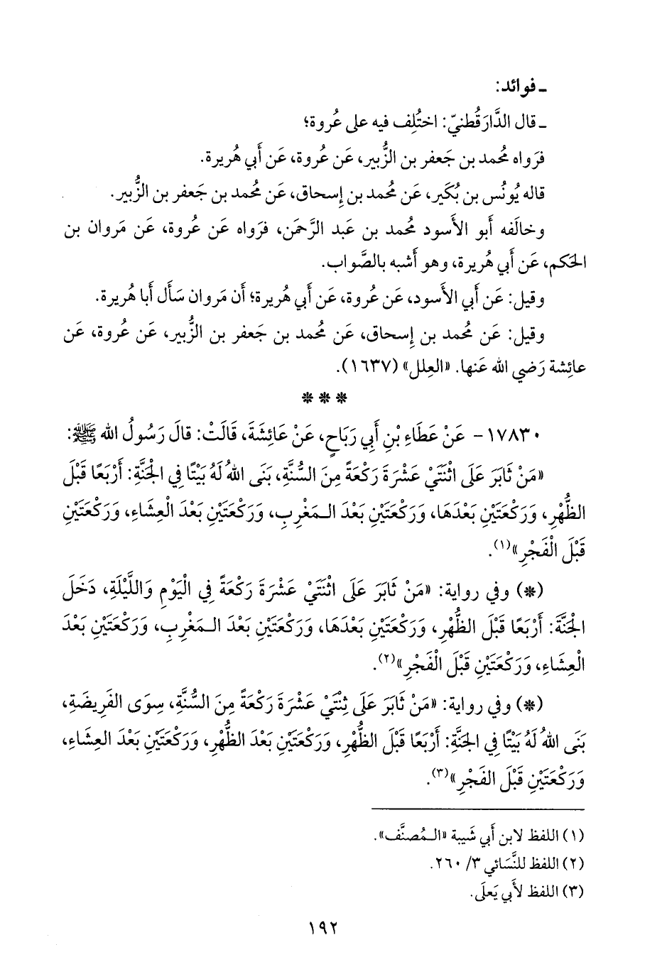 - وفي رواية: «من ثابر على اثنتي عشرة ركعة في اليوم والليلة، دخل الجنة: أربعا قبل الظهر، وركعتين بعدها، وركعتين بعد المغرب، وركعتين بعد العشاء، وركعتين قبل الفجر» (¬٢).