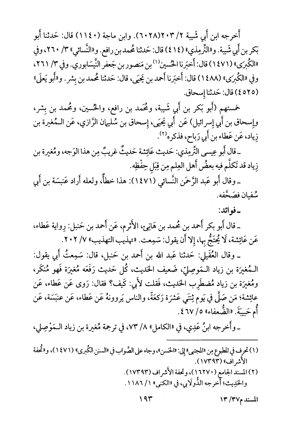 - قلنا: إسناده ضعيفٌ؛ قال عبد الله بن أَحمد بن حنبل: سأَلتُ أبي عن المغيرة بن زياد، فقال: ضعيف الحديث، روى عن عطاء، عن عائشة، عن النبي صَلى الله عَليه وسَلم؛ من صلى في يوم ثِنتي عشرة ركعة، وهذا يرويه عن عطاء، عن عنبسة، عن أُم حبيبة؛ من صلى في يوم ثِنتي عشرة ركعة بني له بيت في الجنة. «العلل ومعرفة الرجال» (٨٣٥).