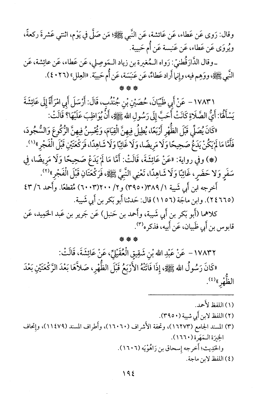 - وفي رواية: «عن قابوس، عن أَبيه، قال: أَرسل أَبي إِلى عائشة: أَي صلاة كانت أَحب إِلى رسول الله صَلى الله عَليه وسَلم أَن يواظب عليها؟ قالت: كان يصلي أَربعا قبل الظهر، يطيل فيهن القيام، ويحسن فيهن الركوع والسجود» (¬٣).