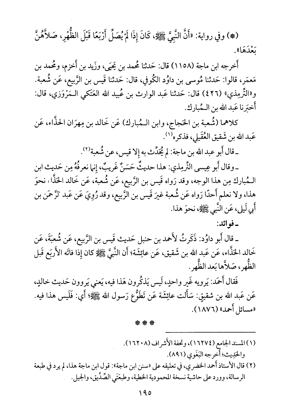 فقال أحمد: يرويه غير واحد، ليس يذكرون هذا فيه، يعني يروون حديث خالد، عن عبد الله بن شقيق: سألت عائشة عن تطوع رسول الله صَلى الله عَليه وسَلم؛ أي: فليس هذا فيه. «مسائل أحمد» (١٨٧٦).