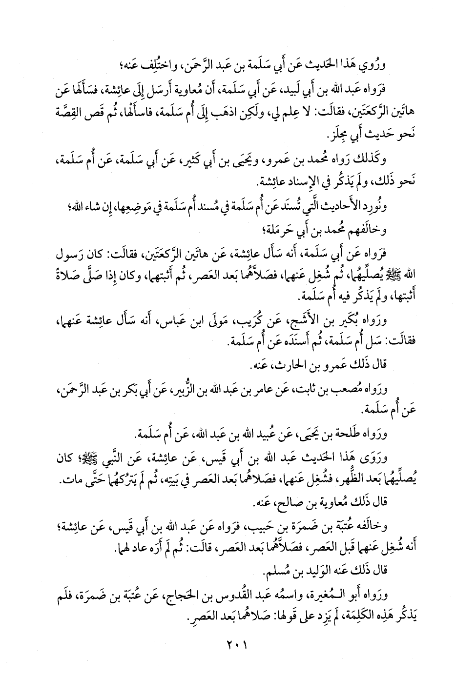 فرواه عن أبي سلمة، أنه سأل عائشة، عن هاتين الركعتين، فقالت: كان رسول الله صَلى الله عَليه وسَلم يصليهما، ثم شغل عنهما، فصلاهما بعد العصر، ثم أثبتهما، وكان إذا صلى صلاة أثبتها، ولم يذكر فيه أُم سلمة.