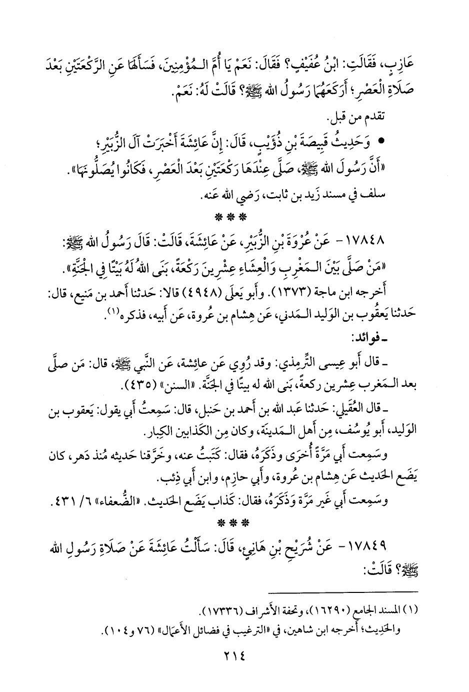 - قال التِّرمِذي: وقد روي عن عائشة، عن النبي صَلى الله عَليه وسَلم قال: من صلى بعد المغرب عشرين ركعة، بنى الله له بيتا في الجنة. «السنن» (٤٣٥).