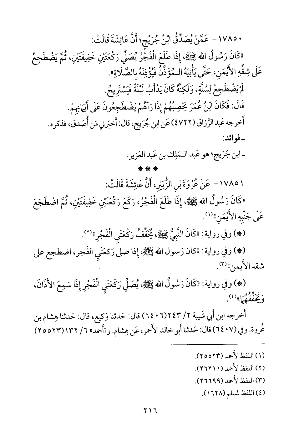 «كان رسول الله صَلى الله عَليه وسَلم إذا طلع الفجر يصلي ركعتين خفيفتين، ثم يضطجع على شقه الأيمن، حتى يأتيه المؤذن فيؤذنه بالصلاة».