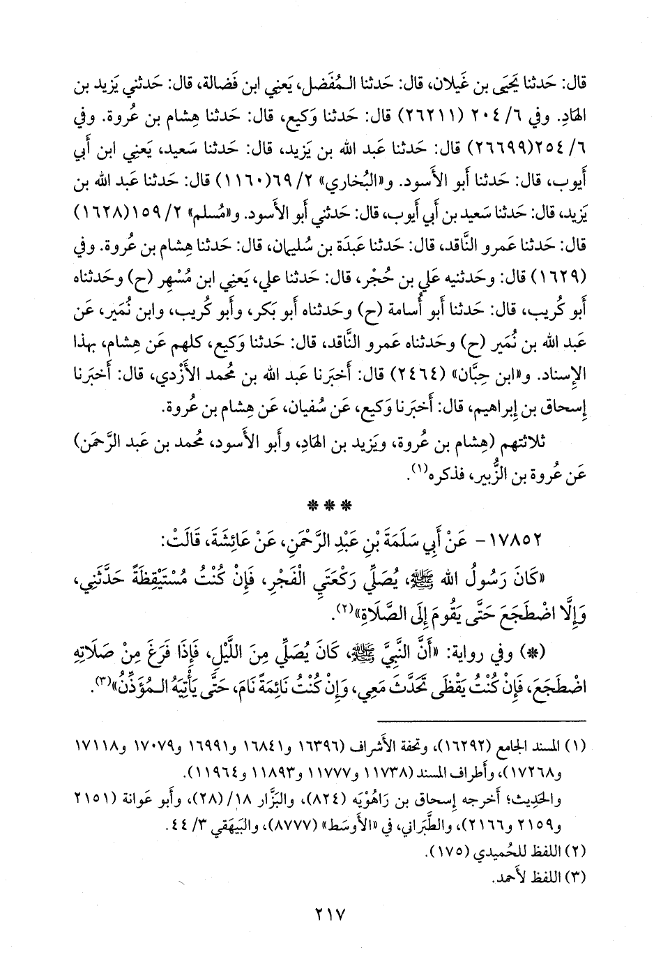 وفي ٦/ ٢٠٤ (٢٦٢١١) قال: حدثنا وكيع، قال: حدثنا هشام بن عروة. وفي ٦/ ٢٥٤ (٢٦٦٩٩) قال: حدثنا عبد الله بن يزيد، قال: حدثنا سعيد، يعني ابن أبي أيوب، قال: حدثنا أَبو الأسود. و «البخاري» ٢/ ٦٩ (١١٦٠) قال: حدثنا عبد الله بن يزيد, قال: حدثنا سعيد بن أبي أيوب، قال: حدثني أَبو الأسود. و «مسلم» ٢/ ١٥٩ (١٦٢٨) قال: حدثنا عَمرو الناقد, قال: حدثنا عَبدة بن سليمان, قال: حدثنا هشام بن عروة. وفي (١٦٢٩) قال: وحدثنيه علي بن حُجْر, قال: حدثنا علي، يعني ابن مُسهِر (ح) وحدثناه أَبو كُريب, قال: حدثنا أَبو أسامة (ح) وحدثناه أَبو بكر، وأَبو كُريب، وابن نُمير، عن عبد الله بن نُمير (ح) وحدثناه عَمرو الناقد, قال: حدثنا وكيع، كلهم عن هشام، بهذا الإسناد. و «ابن حِبَّان» (٢٤٦٤) قال: أخبرنا عبد الله بن محمد الأزدي، قال: أخبرنا إسحاق بن إبراهيم، قال: أخبرنا وكيع، عن سفيان، عن هشام بن عروة.