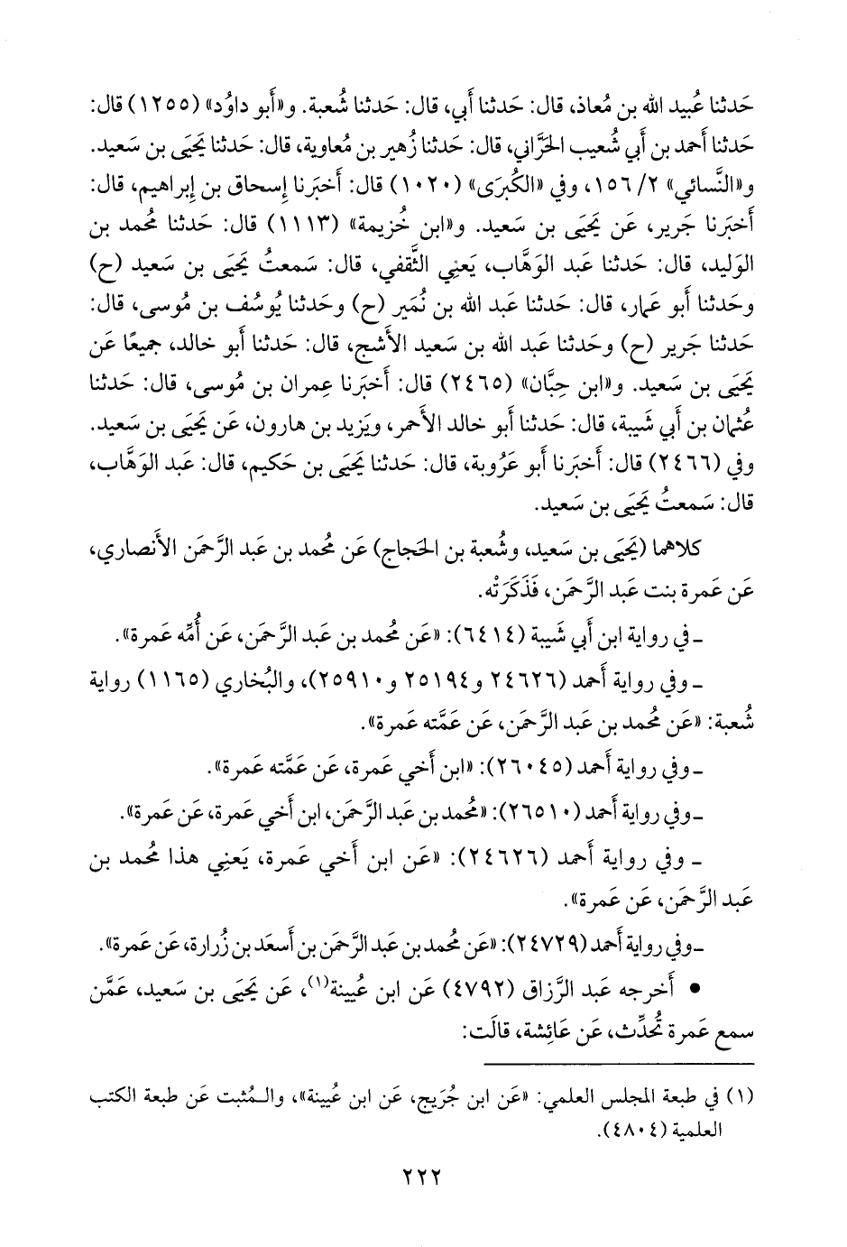 - وفي رواية أَحمد (٢٤٧٢٩): «عن محمد بن عبد الرَّحمَن بن أَسعد بن زُرارة، عن عَمرة».