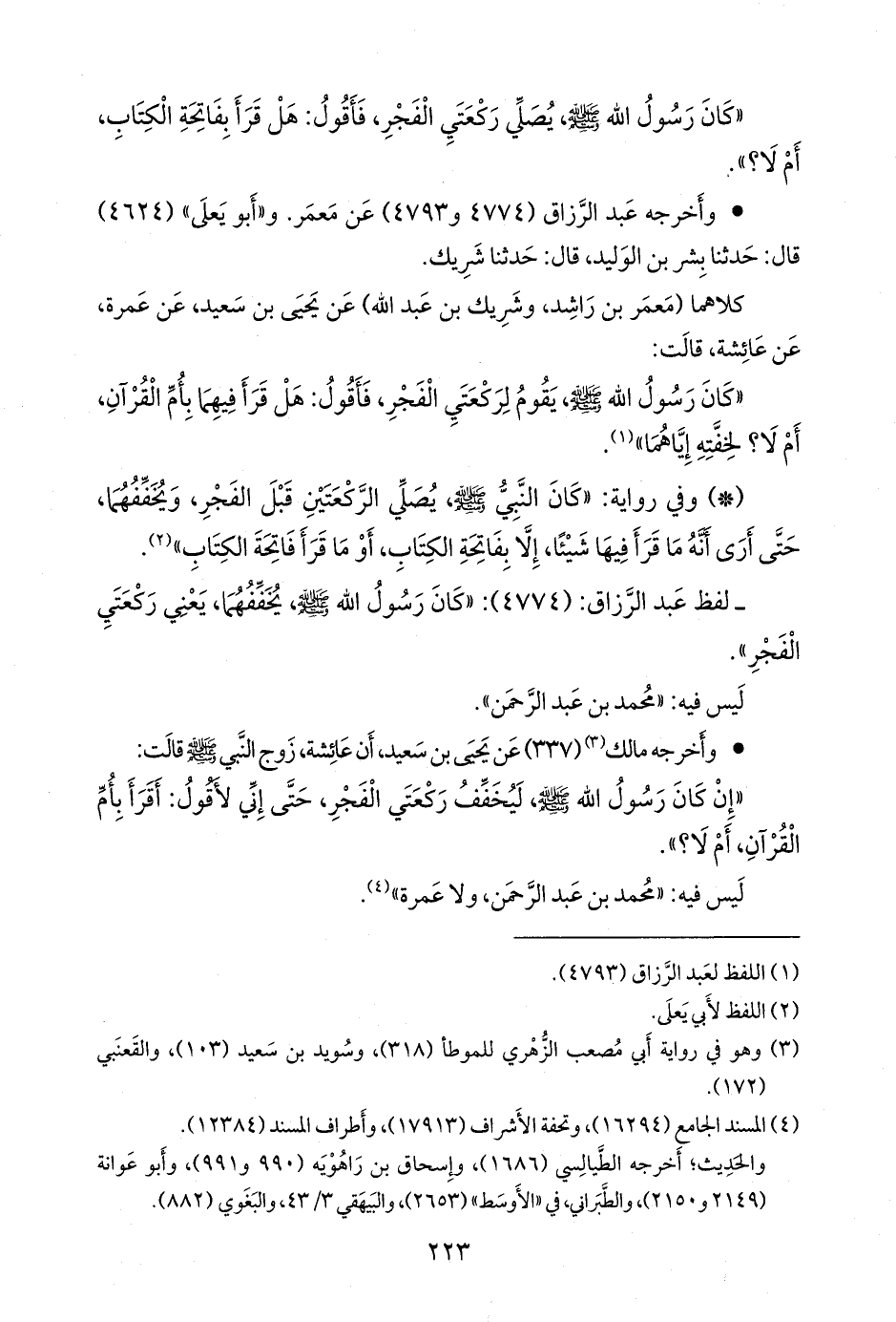 - لفظ عبد الرزاق: (٤٧٧٤): «كان رسول الله صَلى الله عَليه وسَلم يخففهما، يعني ركعتي الفجر».