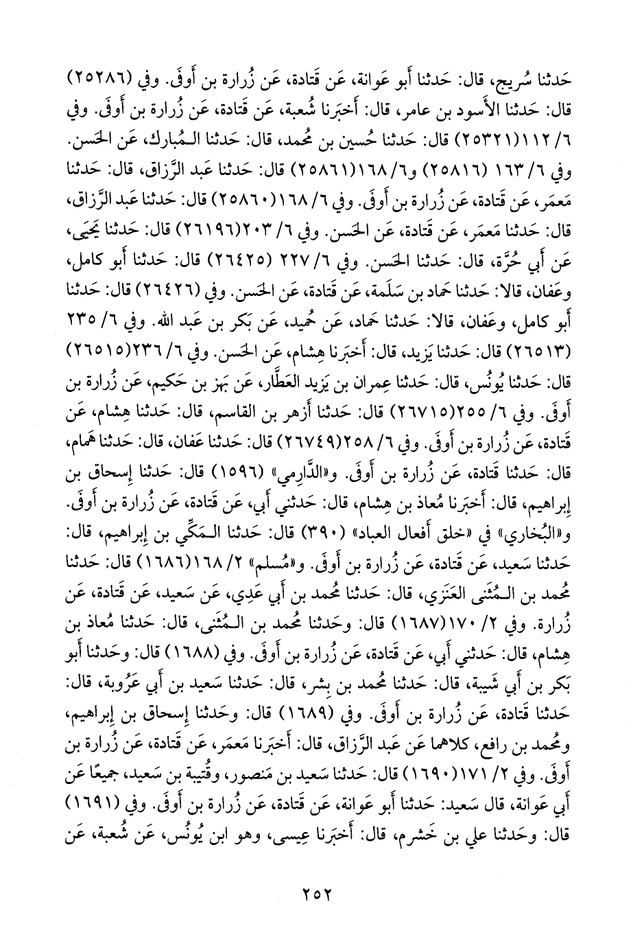 وفي ٦/ ٢٥٨ (٢٦٧٤٩) قال: حدثنا عفان، قال: حدثنا همام, قال: حدثنا قتادة، عن زُرارة بن أوفى. و «الدَّارِمي» (١٥٩٦) قال: حدثنا إسحاق بن إبراهيم، قال: أخبرنا معاذ بن هشام، قال: حدثني أبي، عن قتادة، عن زُرارة بن أوفى. و «البخاري» في «خلق أفعال العباد» (٣٩٠) قال: حدثنا المكي بن إبراهيم، قال: حدثنا سعيد، عن قتادة، عن زُرارة بن أوفى. و «مسلم» ٢/ ١٦٨ (١٦٨٦) قال: حدثنا محمد بن المثنى العنزي, قال: حدثنا محمد بن أَبي عَدي، عن سعيد، عن قتادة، عن زُرارة. وفي ٢/ ١٧٠ (١٦٨٧) قال: وحدثنا محمد بن المثنى, قال: حدثنا معاذ بن هشام، قال: حدثني أبي، عن قتادة، عن زُرارة بن أوفى. وفي (١٦٨٨) قال: وحدثنا أَبو بكر بن أبي شيبة, قال: حدثنا محمد بن بشر, قال: حدثنا سعيد بن أبي عَروبَة, قال: حدثنا قتادة، عن زُرارة بن أوفى. وفي (١٦٨٩) قال: وحدثنا إسحاق بن إبراهيم، ومحمد بن رافع، كلاهما عن عبد الرزاق، قال: أخبرنا مَعمَر، عن قتادة، عن زُرارة بن أوفى. وفي ٢/ ١٧١ (١٦٩٠) قال: حدثنا سعيد بن منصور، وقتيبة بن سعيد، جميعا عن أبي عَوانة، قال سعيد: حدثنا أَبو عَوانة، عن قتادة، عن زُرارة بن أوفى. وفي (١٦٩١) قال: وحدثنا علي بن خشرم، قال: أخبرنا عيسى، وهو ابن يونس، عن شعبة، عن