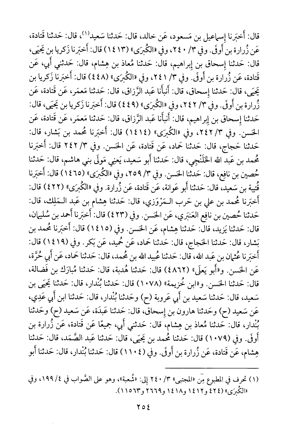 وفي «الكبرى» (٤٢٢) قال: أخبرنا محمد بن علي بن حرب المَرْوَزي، قال: حدثنا هشام بن عبد الملك، قال: حدثنا حصين بن نافع العنبري، عن الحسن. وفي (٤٢٣) قال: أخبرنا أحمد بن سليمان، قال: حدثنا يزيد، قال: حدثنا هشام، عن الحسن. وفي (١٤١٥) قال: أخبرنا محمد بن بشار، قال: حدثنا الحجاج، قال: حدثنا حماد، عن حميد، عن بكر. وفي (١٤١٩) قال: أخبرنا عثمان بن عبد الله، قال: حدثنا عُبيد الله بن محمد، قال: حدثنا حماد، عن أبي حُرَّة، عن الحسن. و «أَبو يَعلى» (٤٨٦٢) قال: حدثنا هُدبة، قال: حدثنا مبارك بن فضالة، قال: حدثنا الحسن. و «ابن خزيمة» (١٠٧٨) قال: حدثنا بندار, قال: حدثنا يحيى بن سعيد, قال: حدثنا سعيد بن أبي عَروبَة (ح) وحدثنا بندار, قال: حدثنا ابن أَبي عَدي، عن سعيد (ح) وحدثنا هارون بن إسحاق, قال: حدثنا عبدة، عن سعيد (ح) وحدثنا بندار, قال: حدثنا معاذ بن هشام، قال: حدثني أبي، جميعا عن قتادة، عن زُرارة بن أوفى. وفي (١٠٧٩) قال: حدثنا محمد بن يحيى، قال: حدثنا عبد الصمد، قال: حدثنا هشام، عن قتادة، عن زُرارة بن أوفى. وفي (١١٠٤) قال: حدثنا بندار, قال: حدثنا أَبو