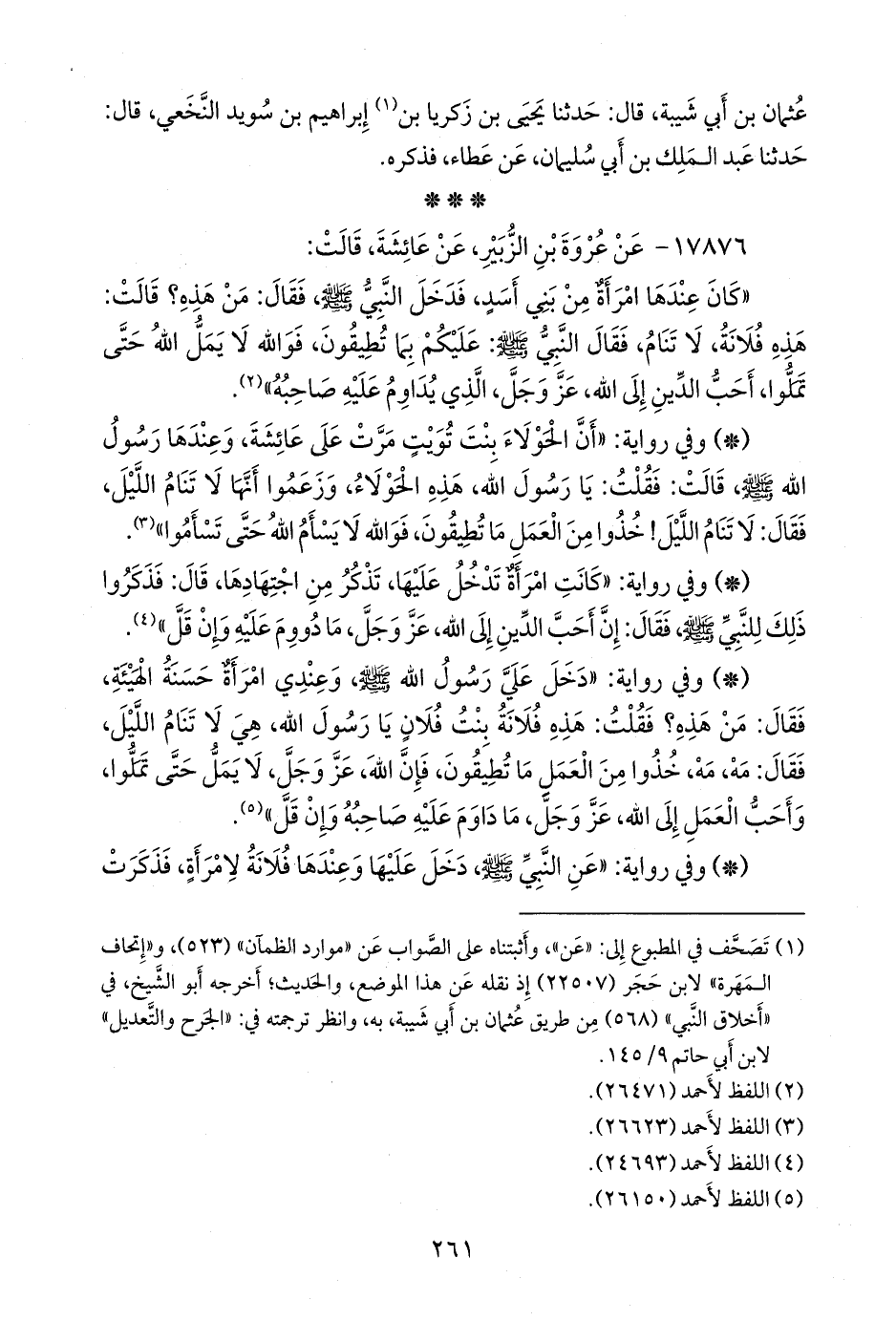 - وفي رواية: «كانت امرأة تدخل عليها، تذكر من اجتهادها، قال: فذكروا ذلك للنبي صَلى الله عَليه وسَلم فقال: إن أحب الدين إلى الله، عز وجل، ما دووم عليه وإن قل» (¬٣).