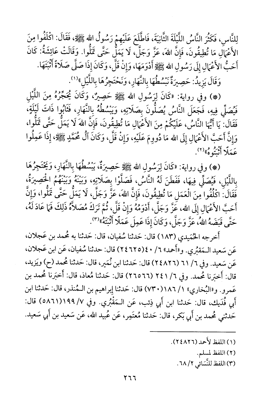 - وفي رواية: «كان لرسول الله صَلى الله عَليه وسَلم حصير، وكان يحجره من الليل فيصلي فيه، فجعل الناس يصلون بصلاته، ويبسطه بالنهار، فثابوا ذات ليلة، فقال: يا أيها الناس، عليكم من الأعمال ما تطيقون، فإن الله لا يمل حتى تملوا، وإن أحب الأعمال إلى الله ما دووم عليه، وإن قل، وكان آل محمد صَلى الله عَليه وسَلم إذا عملوا عملا أثبتوه» (¬٢).
