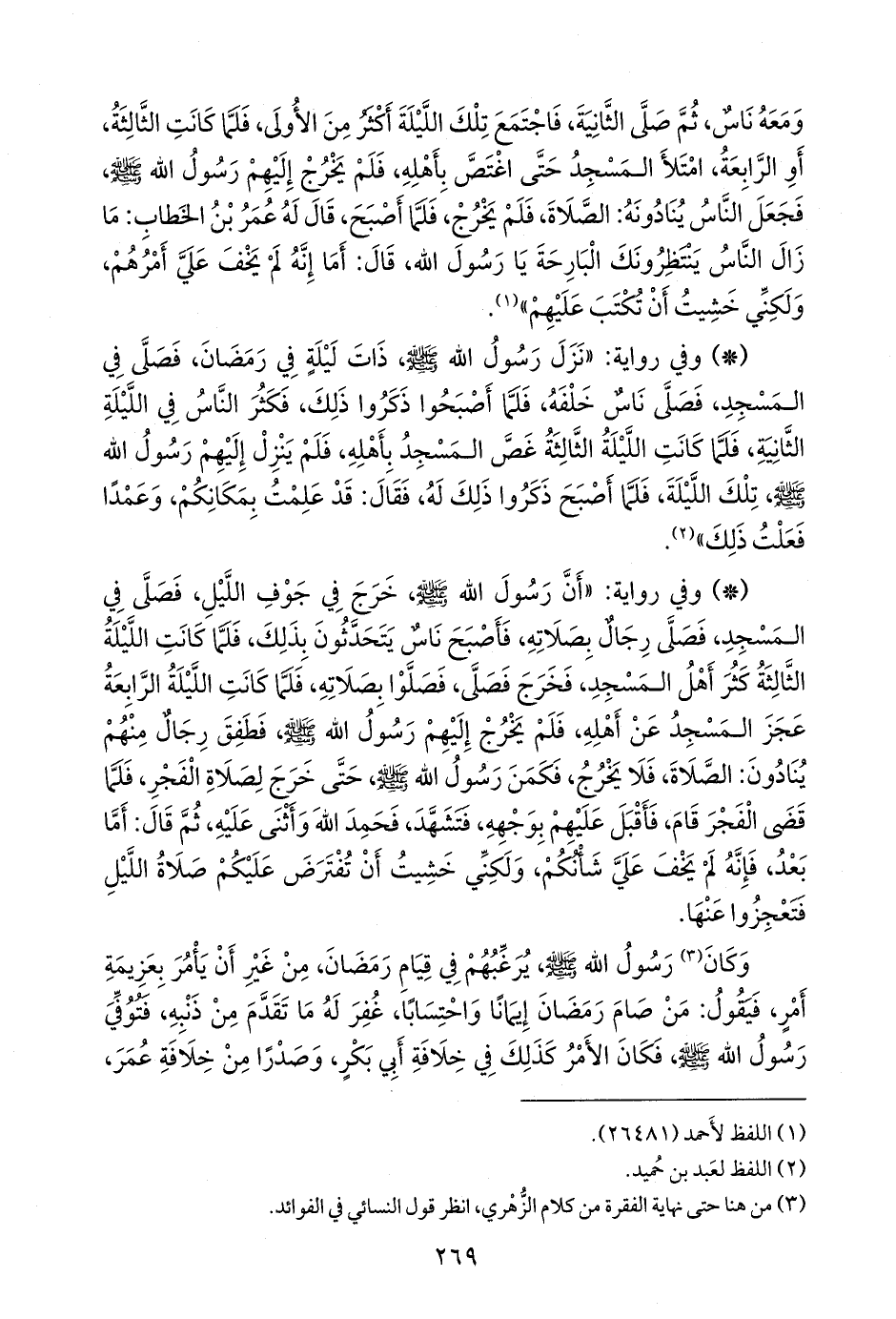 - وفي رواية: «أن رسول الله صَلى الله عَليه وسَلم خرج في جوف الليل، فصلى في المسجد، فصلى رجال بصلاته، فأصبح ناس يتحدثون بذلك، فلما كانت الليلة الثالثة كثر أهل المسجد، فخرج فصلى، فصلوا بصلاته، فلما كانت الليلة الرابعة عجز المسجد عن أهله، فلم يخرج إليهم رسول الله صَلى الله عَليه وسَلم فطفق رجال منهم ينادون: الصلاة، فلا يخرج، فكمن رسول الله صَلى الله عَليه وسَلم حتى خرج لصلاة الفجر، فلما قضى الفجر قام، فأقبل عليهم بوجهه، فتشهد، فحمد الله وأثنى عليه، ثم قال: أما بعد، فإنه لم يخف علي شانكم، ولكني خشيت أن تفترض عليكم صلاة الليل فتعجزوا عنها.