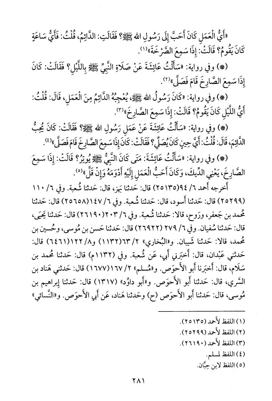 أخرجه أحمد (٢٥١٣٥) قال: حدثنا بَهز، قال: حدثنا شعبة. وفي ٦/ ١١٠ (٢٥٢٩٩) قال: حدثنا أسود، قال: حدثنا شعبة. وفي ٦/ ١٤٧ (٢٥٦٥٨) قال: حدثنا محمد بن جعفر، وروح، قالا: حدثنا شعبة. وفي ٦/ ٢٠٣ (٢٦١٩٠) قال: حدثنا يحيى، قال: حدثنا سفيان. وفي ٦/ ٢٧٩ (٢٦٩٢٢) قال: حدثنا حسن بن موسى، وحسين بن محمد، قالا: حدثنا شَيبان. و «البخاري» ٢/ ٦٣ (١١٣٢) و ٨/ ١٢٢ (٦٤٦١) قال: حدثني عبدان، قال: أخبرني أبي، عن شعبة. وفي (١١٣٢ م) قال: حدثنا محمد بن سَلَام، قال: أخبرنا أَبو الأحوص. و «مسلم» ٢/ ١٦٧ (١٦٧٧) قال: حدثني هَنَّاد بن السَّري, قال: حدثنا أَبو الأحوص. و «أَبو داود» (١٣١٧) قال: حدثنا إبراهيم بن موسى, قال: حدثنا أَبو الأحوص (ح) وحدثنا هَنَّاد، عن أبي الأحوص. و «النَّسَائي»