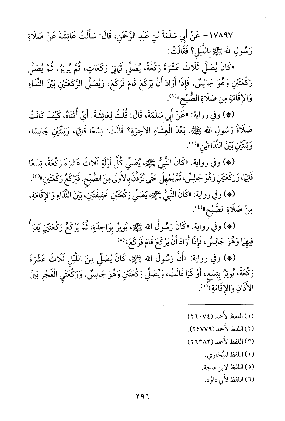 - وفي رواية: «عن أبي سلمة، قال: قلت لعائشة: أي أمتاه، كيف كانت صلاة رسول الله صَلى الله عَليه وسَلم بعد العشاء الآخرة؟ قالت: تسعا قائما، وثنتين جالسا، وثنتين بين النداءين» (¬٢).