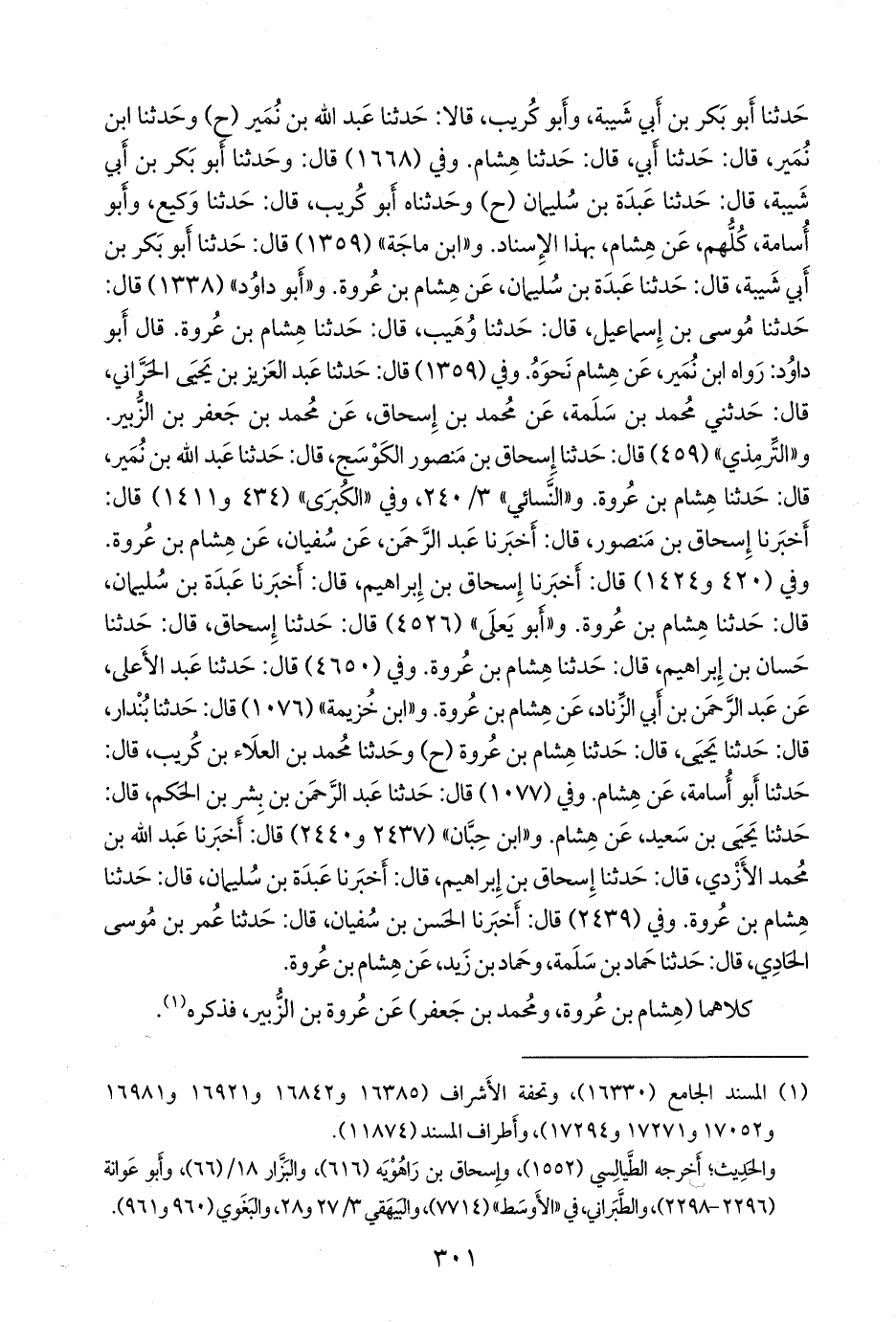 و «أَبو يَعلى» (٤٥٢٦) قال: حدثنا إسحاق، قال: حدثنا حسان بن إبراهيم، قال: حدثنا هشام بن عروة. وفي (٤٦٥٠) قال: حدثنا عبد الأعلى، عن عبد الرَّحمَن بن أبي الزناد، عن هشام بن عروة. وفي (٤٦٥٧) قال: حدثنا عبد الأَعلى، حدثنا عبد الله بن داود، قال: سمعتُ هشام بن عروة. و «ابن خزيمة» (١٠٧٦) قال: حدثنا بندار, قال: حدثنا يحيى، قال: حدثنا هشام بن عروة (ح) وحدثنا محمد بن العلاء بن كُريب, قال: حدثنا أَبو أسامة، عن هشام. وفي (١٠٧٧) قال: حدثنا عبد الرَّحمَن بن بشر بن الحكم, قال: حدثنا يحيى بن سعيد، عن هشام. و «ابن حِبَّان» (٢٤٣٧ و ٢٤٤٠) قال: أخبرنا عبد الله بن محمد الأزدي، قال: حدثنا إسحاق بن إبراهيم، قال: أخبرنا عَبدة بن سليمان، قال: حدثنا هشام بن عروة. وفي (٢٤٣٩) قال: أخبرنا الحسن بن سفيان، قال: حدثنا عمر بن موسى الحادي، قال: حدثنا حماد بن سلمة، وحماد بن زيد، عن هشام بن عروة.