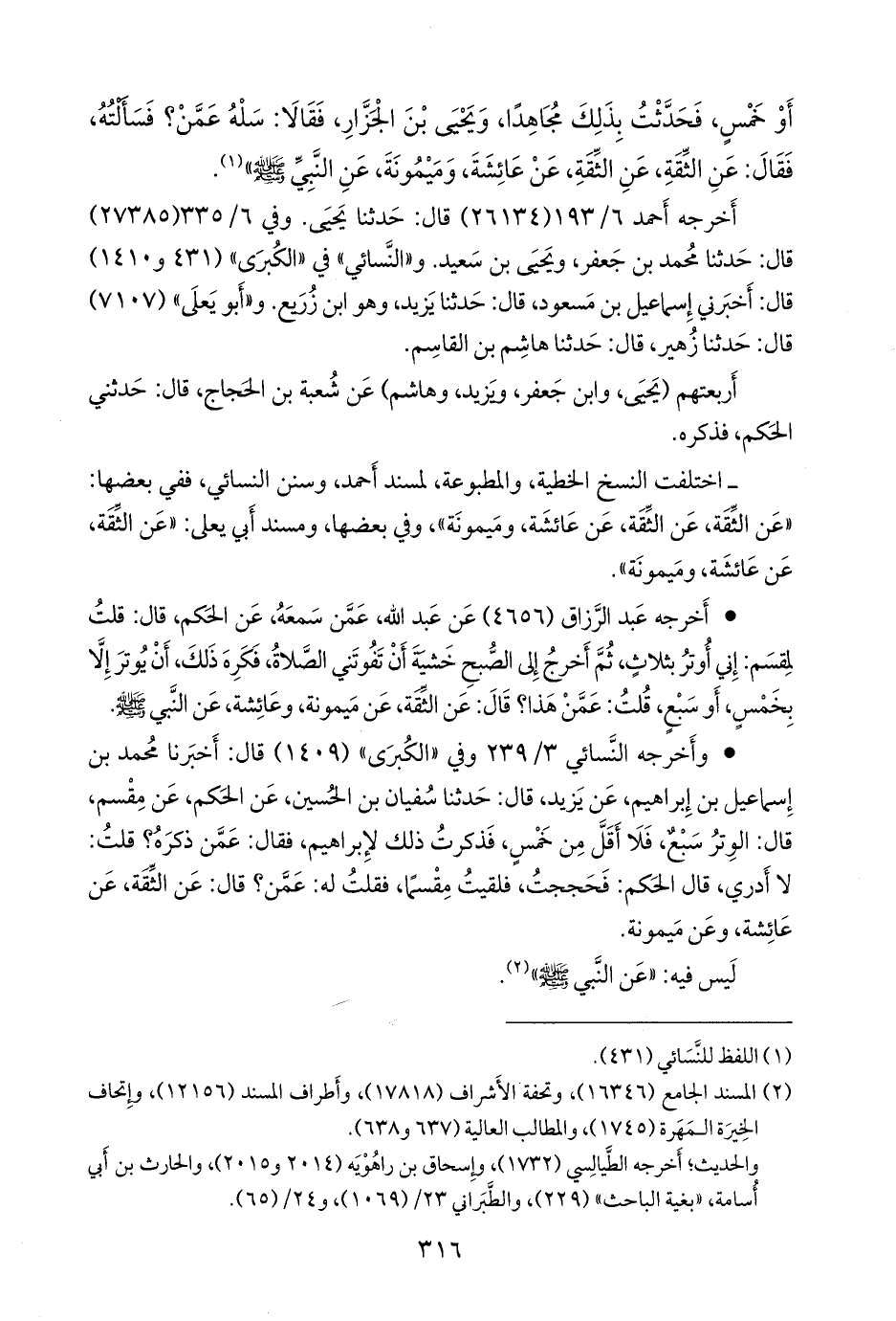 - اختلفت النسخ الخطية، والمطبوعة، لمسند أحمد، وسنن النَّسَائي، ففي بعضها: «عن الثقة، عن الثقة، عن عائشة، وميمونة»، وفي بعضها، ومسند أبي يَعلى: «عن الثقة، عن عائشة، وميمونة».