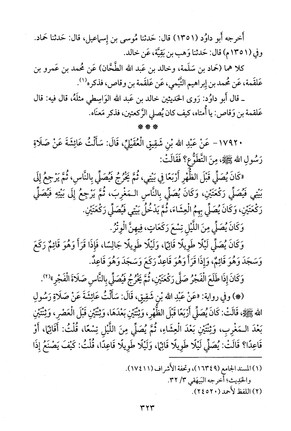 - وفي رواية: «عن عبد الله بن شقيق، قال: سألت عائشة عن صلاة رسول الله صَلى الله عَليه وسَلم قالت: كان يصلي أربعا قبل الظهر، وثنتين بعدها، وثنتين قبل العصر، وثنتين بعد المغرب، وثنتين بعد العشاء، ثم يصلي من الليل تسعا، قلت: أقائما، أو قاعدا؟ قالت: يصلي ليلا طويلا قائما، وليلا طويلا قاعدا، قلت: كيف يصنع إذا