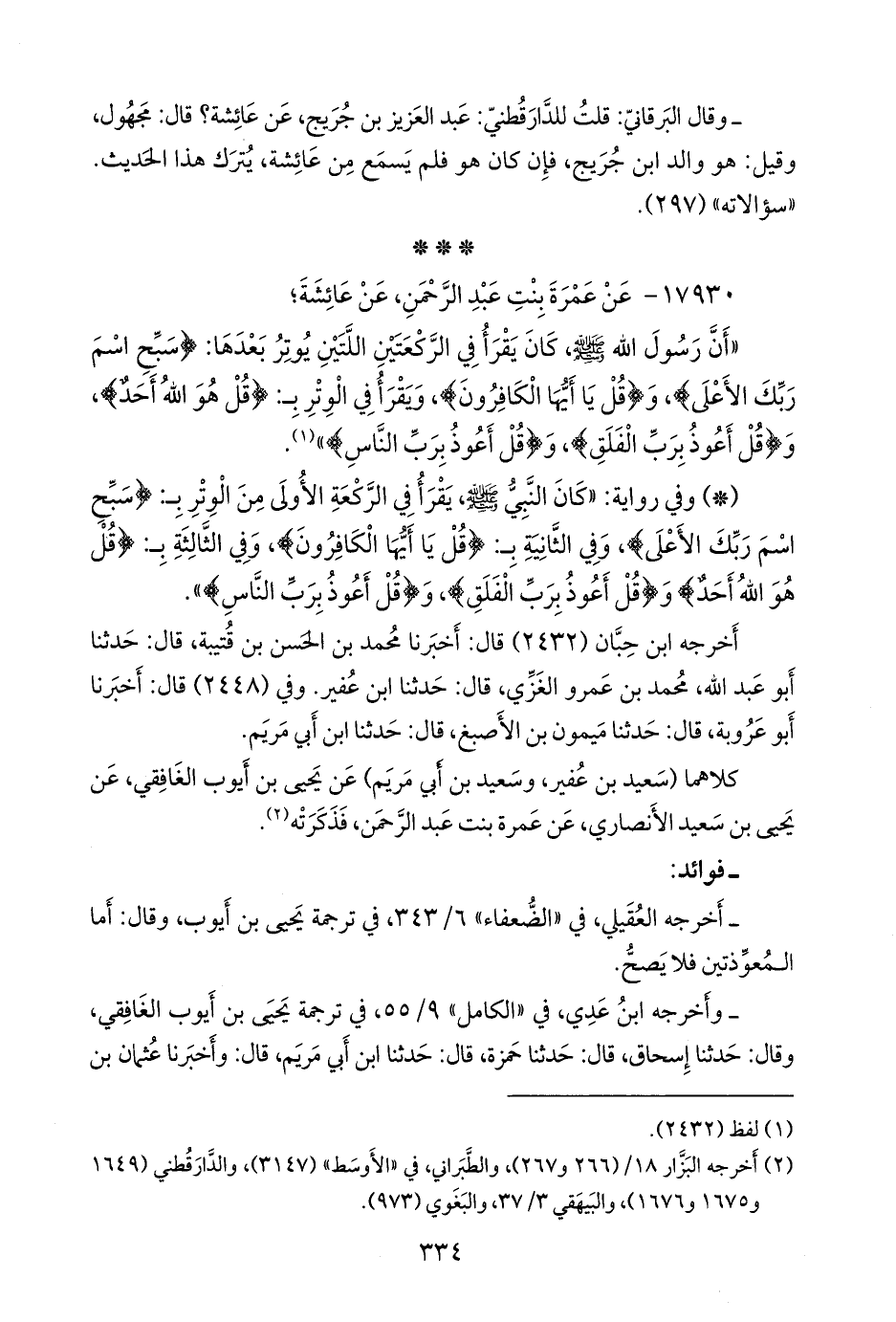 حدثنا موسى بن العباس، قال: حدثنا إبراهيم بن سليمان البرلسي، قال: حدثنا ابن أبي مريم، قال: حدثنا عثمان بن الحكم الحزامي، سألت يحيى بن سعيد عن حديث عَمرَة، عن عائشة؛ أن النبي صَلى الله عَليه وسَلم كان يقرأ في الوتر بـ: {سَبِّحِ اسْمَ رَبِّكَ الأَعْلَى}، و {قُلْ يَا أَيُّهَا الْكَافِرُونَ}، و {قُلْ هُوَ اللهُ أَحَدٌ}، فلم يعرفه وأنكره.