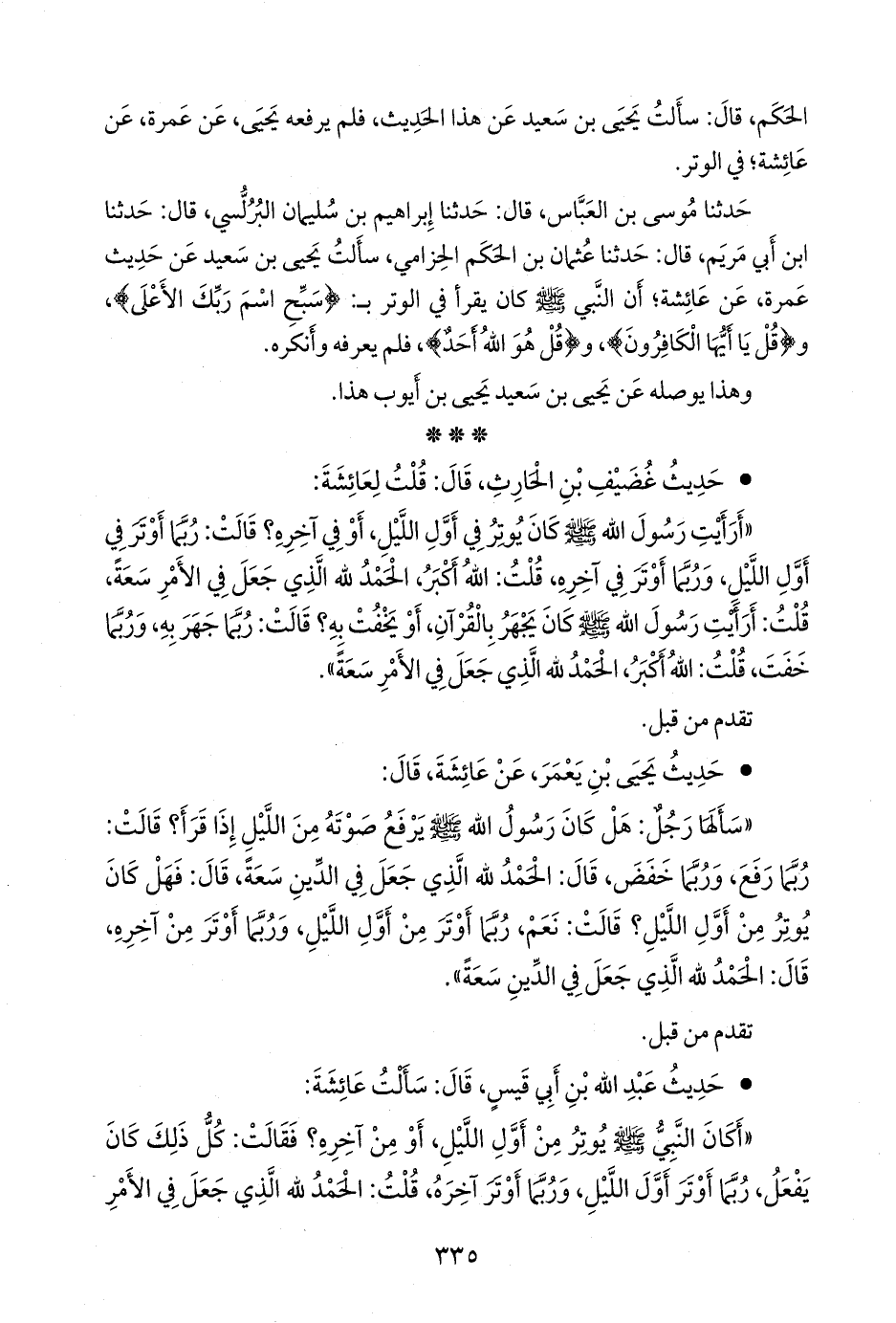 «سألها رجل: هل كان رسول الله صَلى الله عَليه وسَلم يرفع صوته من الليل إذا قرأ؟ قالت: ربما رفع، وربما خفض، قال: الحمد لله الذي جعل في الدين سعة، قال: فهل كان يوتر من أول الليل؟ قالت: نعم، ربما أوتر من أول الليل، وربما أوتر من آخره، قال: الحمد لله الذي جعل في الدين سعة».
