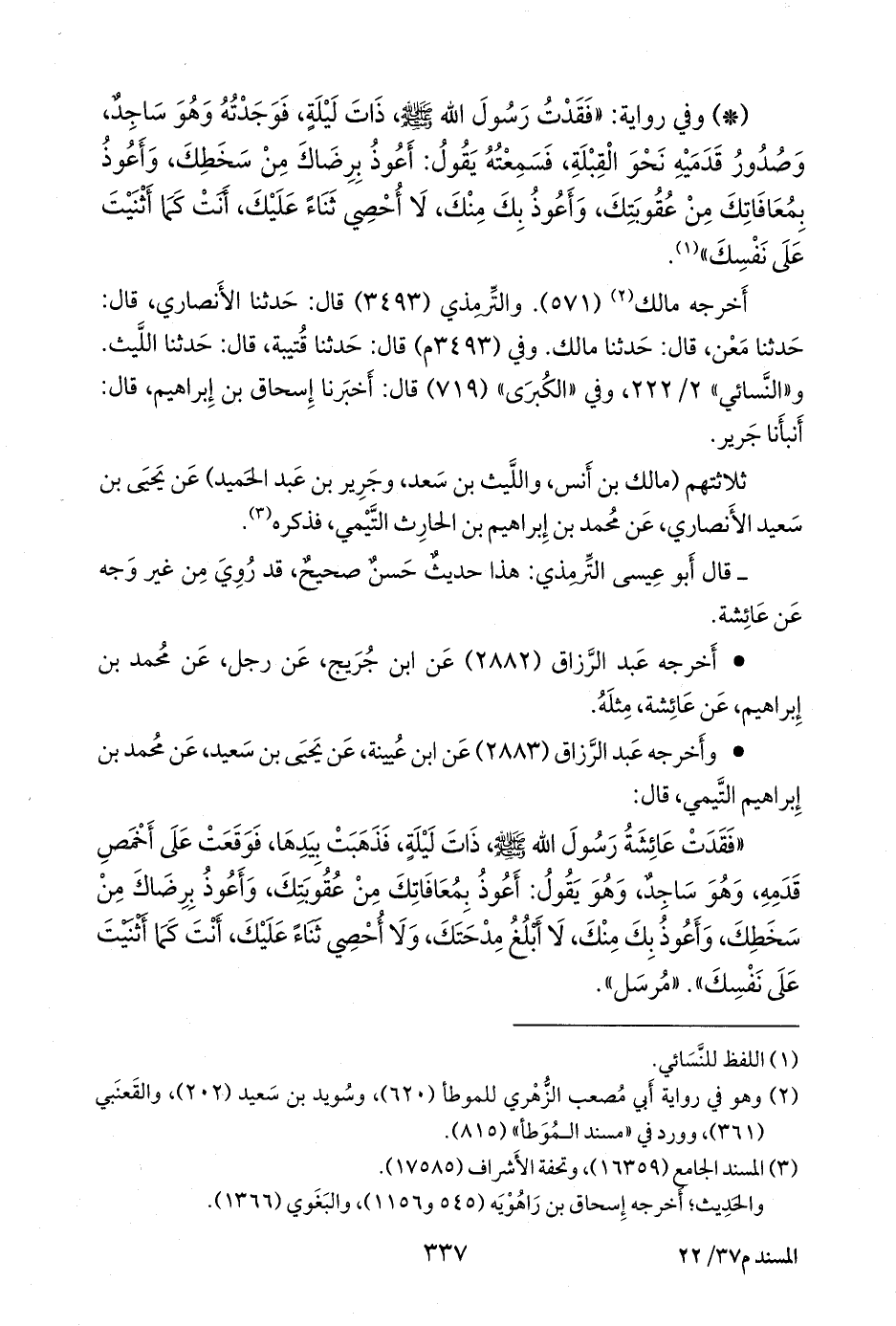 «فقدت عائشة رسول الله صَلى الله عَليه وسَلم ذات ليلة، فذهبت بيدها، فوقعت على أخمص قدمه، وهو ساجد، وهو يقول: أعوذ بمعافاتك من عقوبتك، وأعوذ برضاك من سخطك، وأعوذ بك منك، لا أبلغ مدحتك، ولا أحصي ثناء عليك، أنت كما أثنيت على نفسك». «مُرسَل».