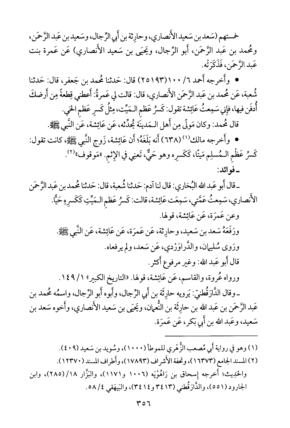 • وأخرجه أحمد (٢٥١٩٣) قال: حدثنا محمد بن جعفر، قال: حدثنا شعبة، عن محمد بن عبد الرَّحمَن الأَنصاري، قال: قالت لي عمرة: أعطني قطعة من أرضك أدفن فيها، فإني سمعت عائشة تقول: كسر عظم الميت، مثل كسر عظم الحي.
