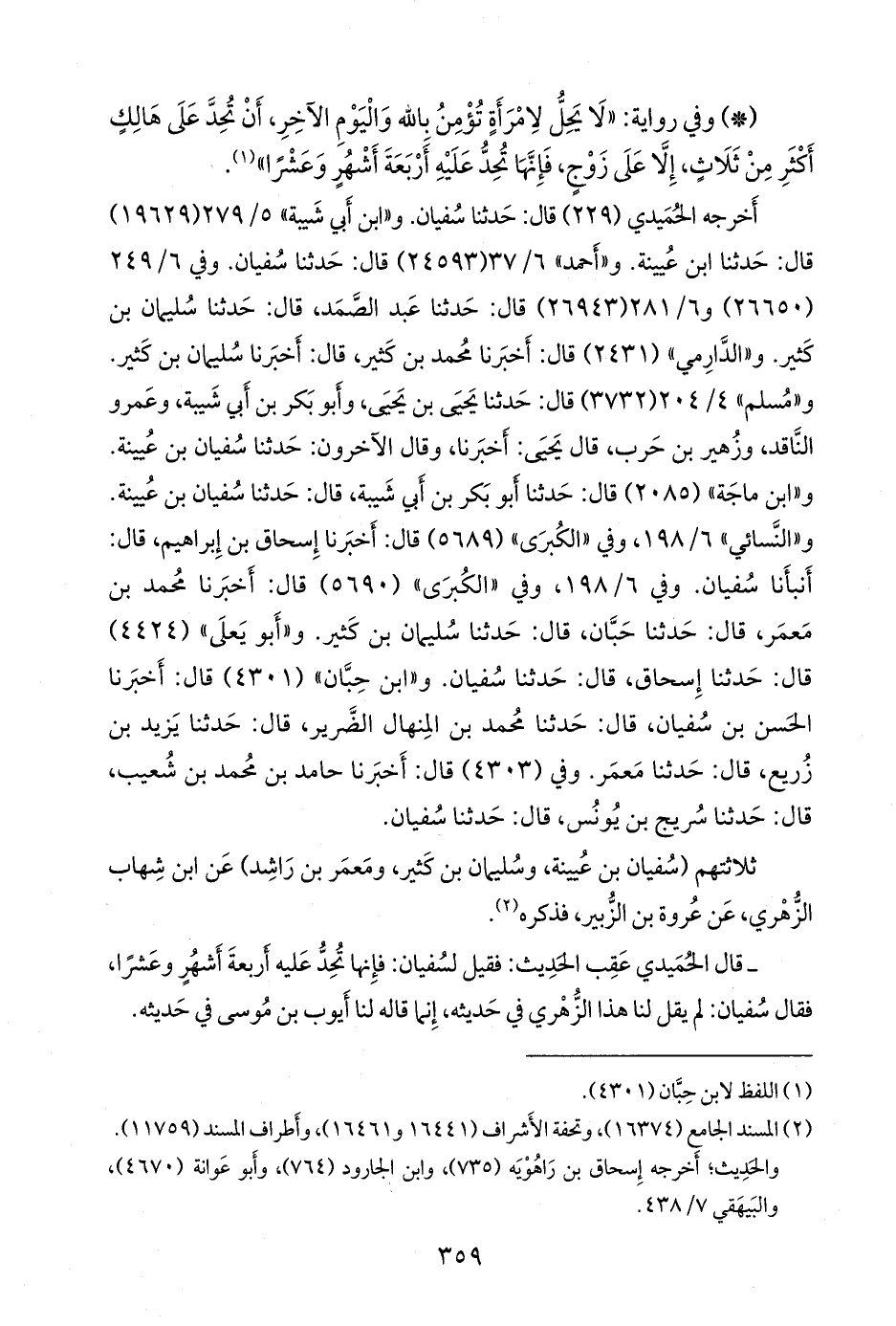 - قال الحميدي عقب الحديث: فقيل لسفيان: فإنها تحد عليه أربعة أشهر وعشرا، فقال سفيان: لم يقل لنا هذا الزُّهْري في حديثه، إنما قاله لنا أيوب بن موسى في حديثه.