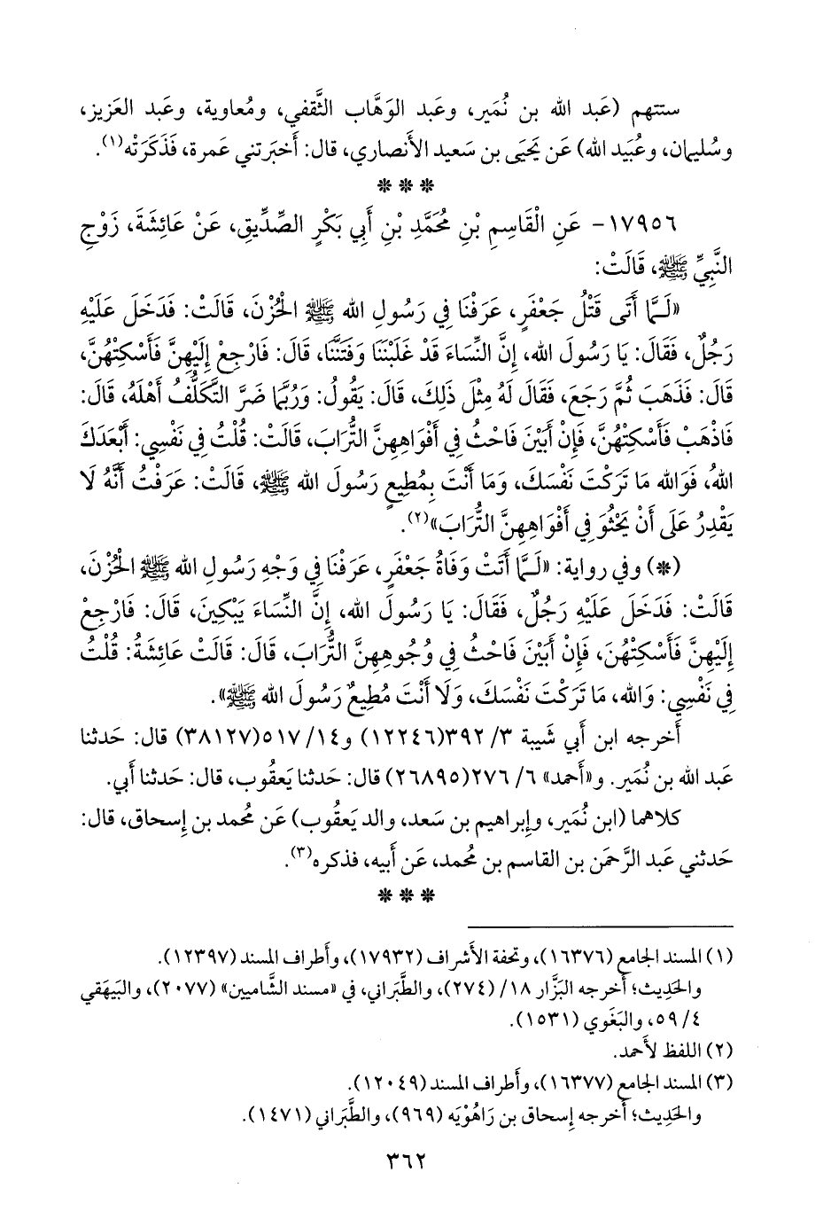 ١٧٩٥٦ - عن القاسم بن محمد بن أَبي بكر الصِّدِّيق، عن عائشة، زوج النبي صَلى الله عَليه وسَلم قالت: